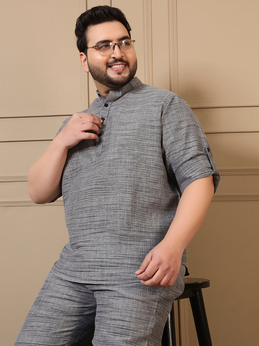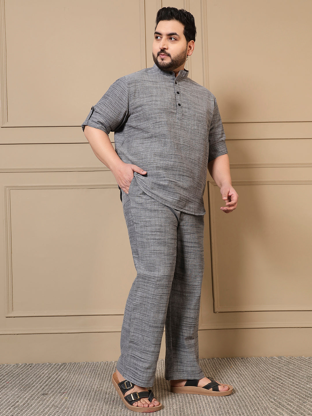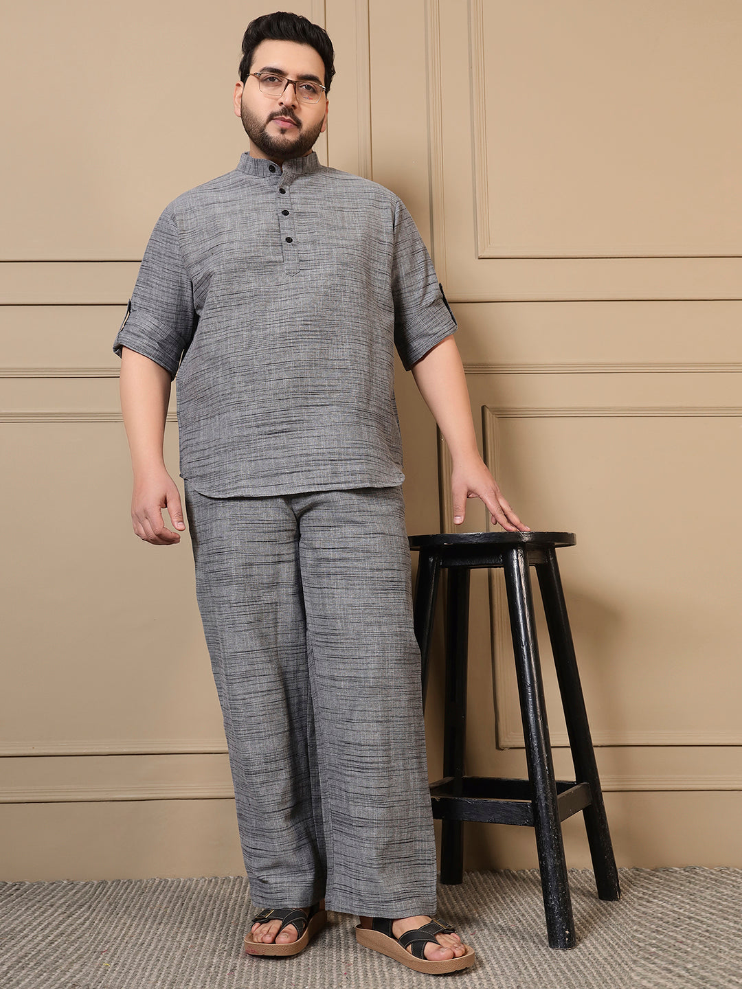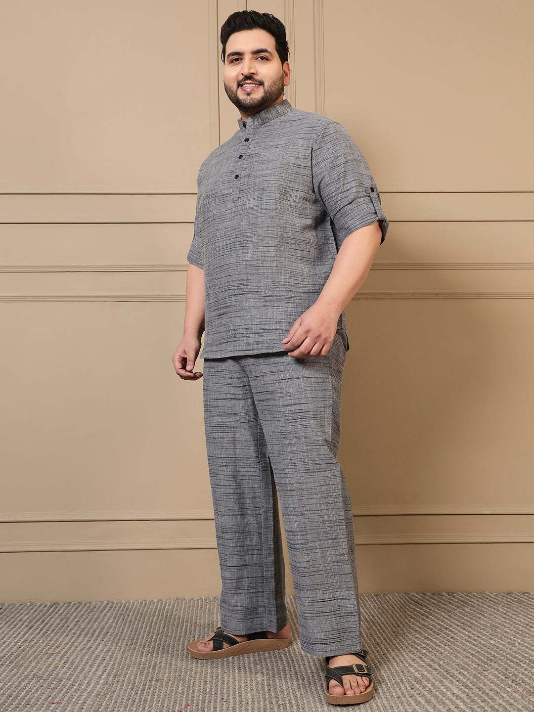 Grey Cotton Textured Printed Men Plus Size Co-ord Set