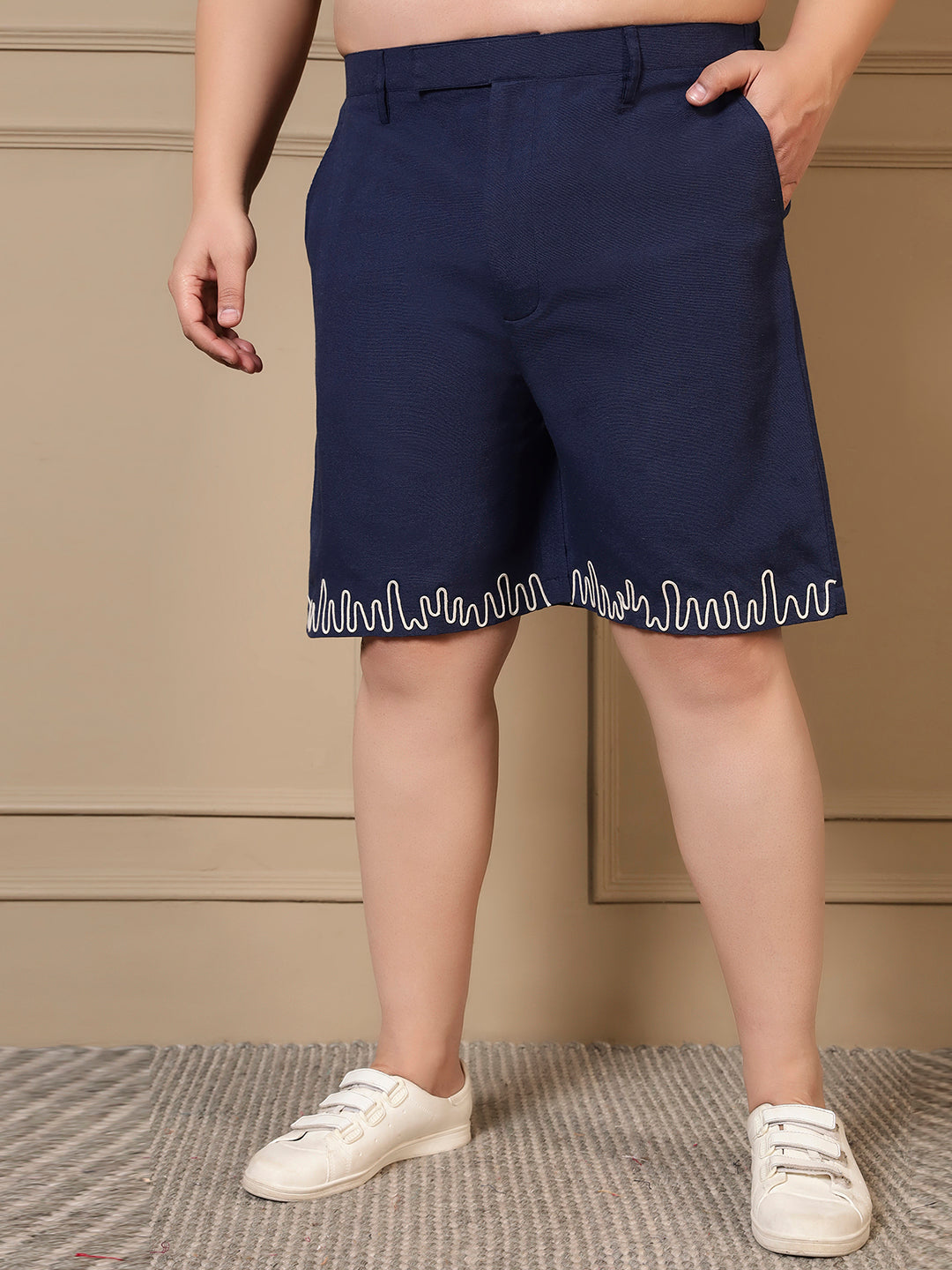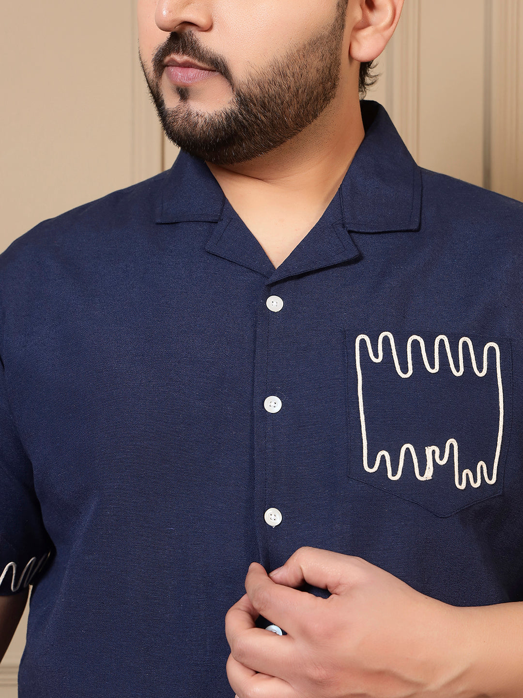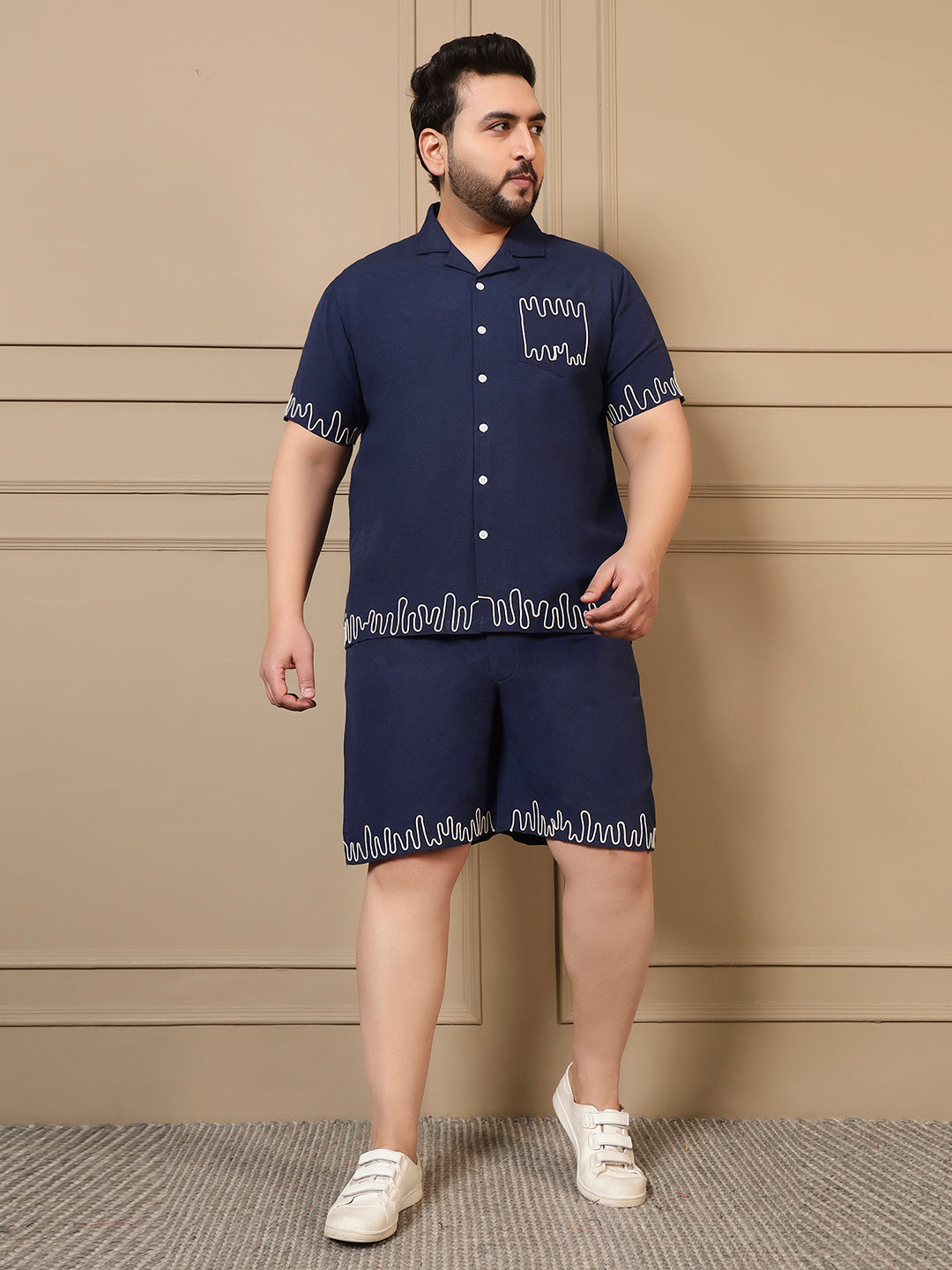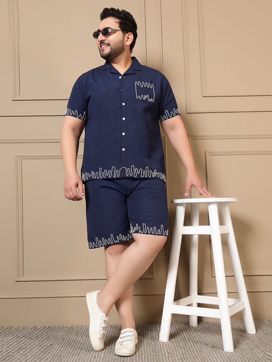 Navy Blue Cotton Embroidered Shirt With Shorts Men Plus Size Co-ord Set