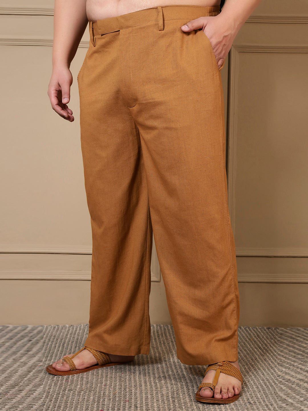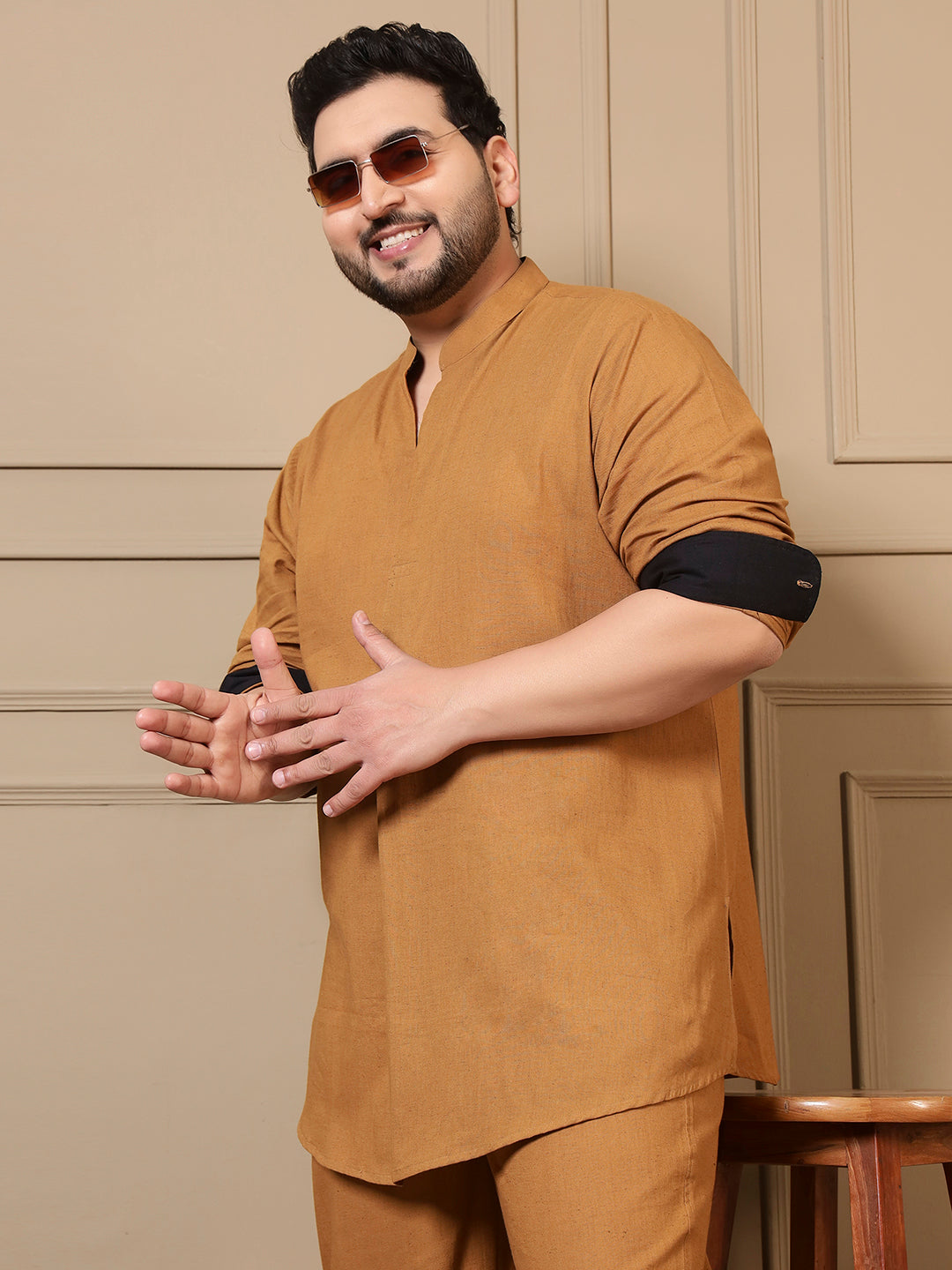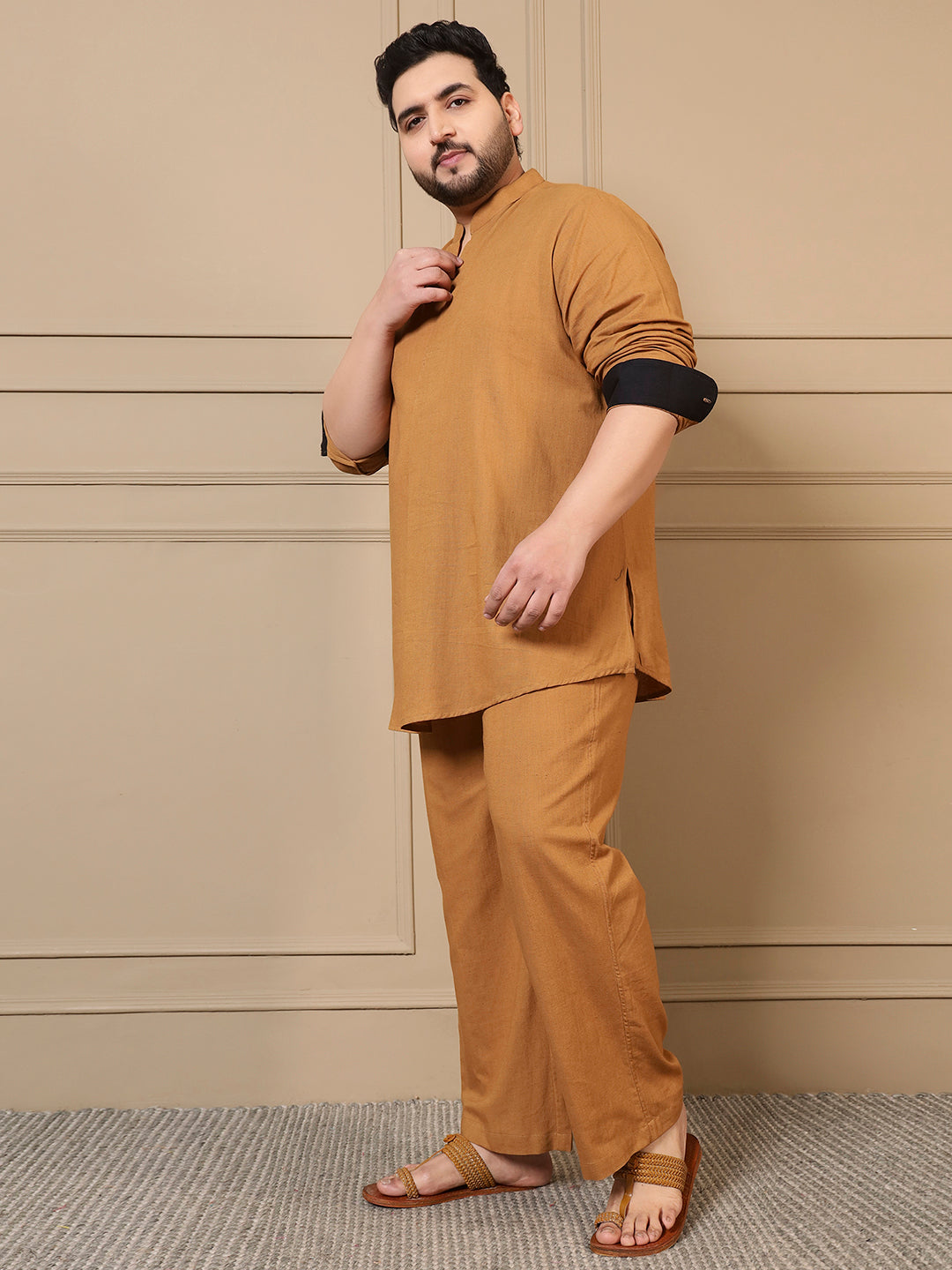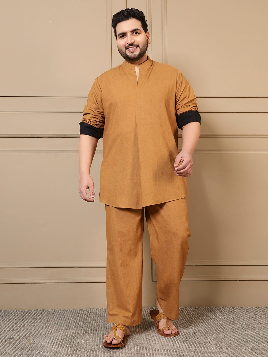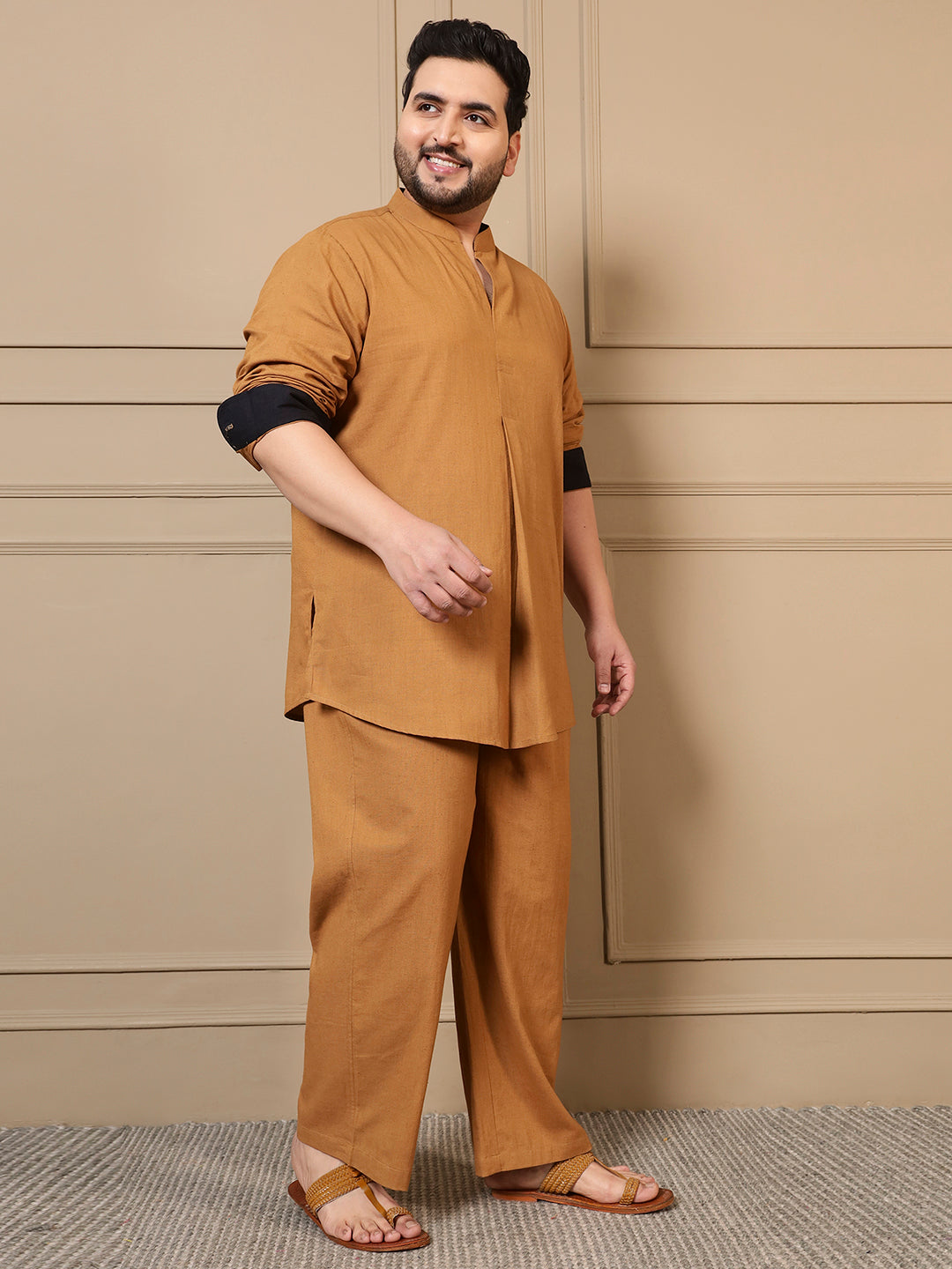 Beige Cotton Pleated Kurta With Pant Men Plus Size Co-ord Set