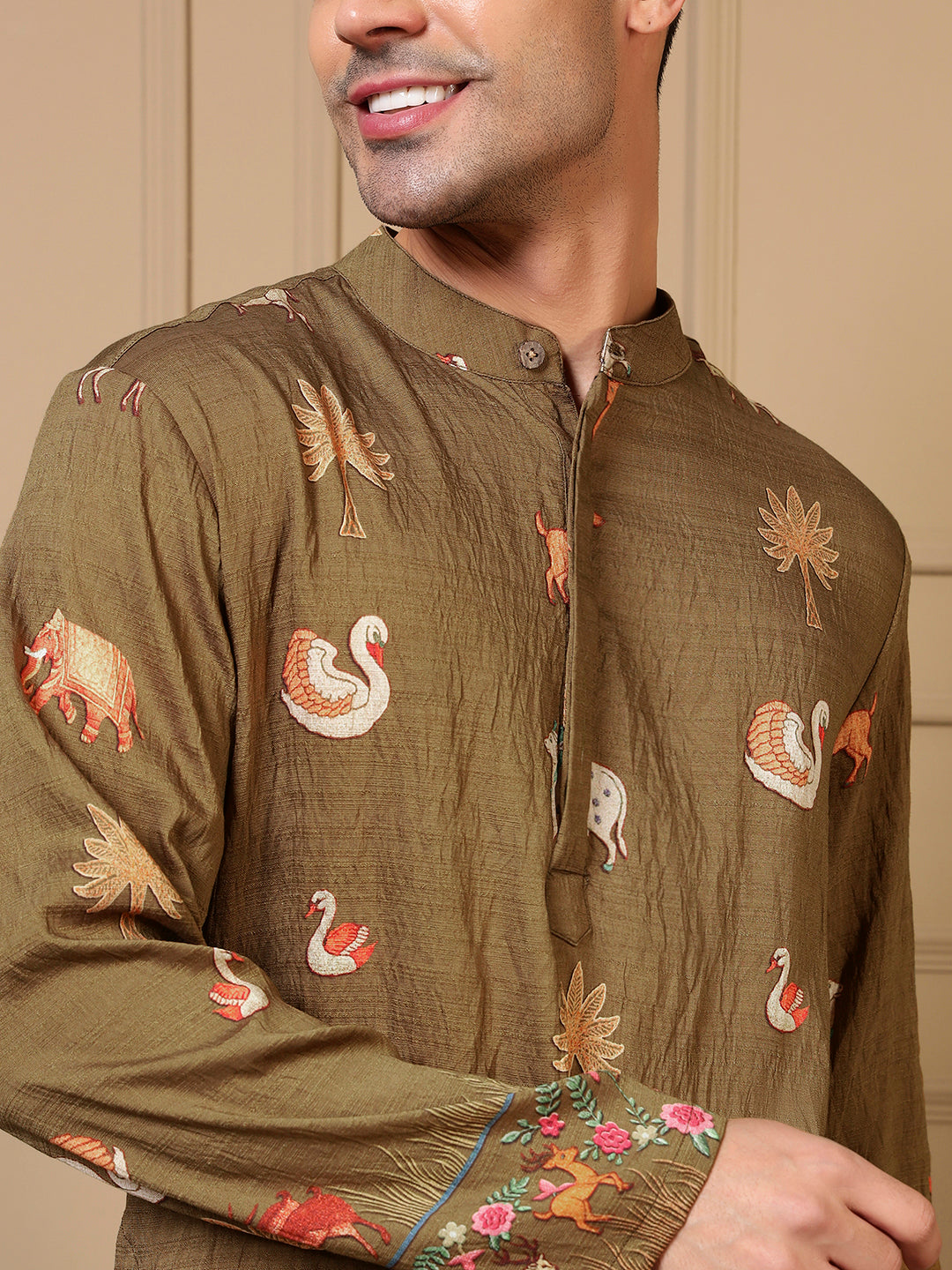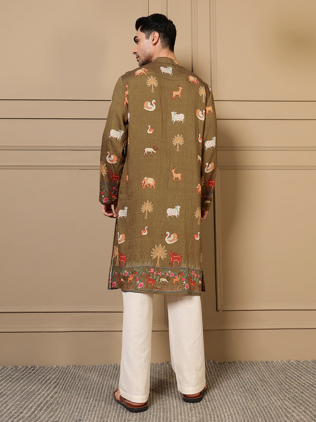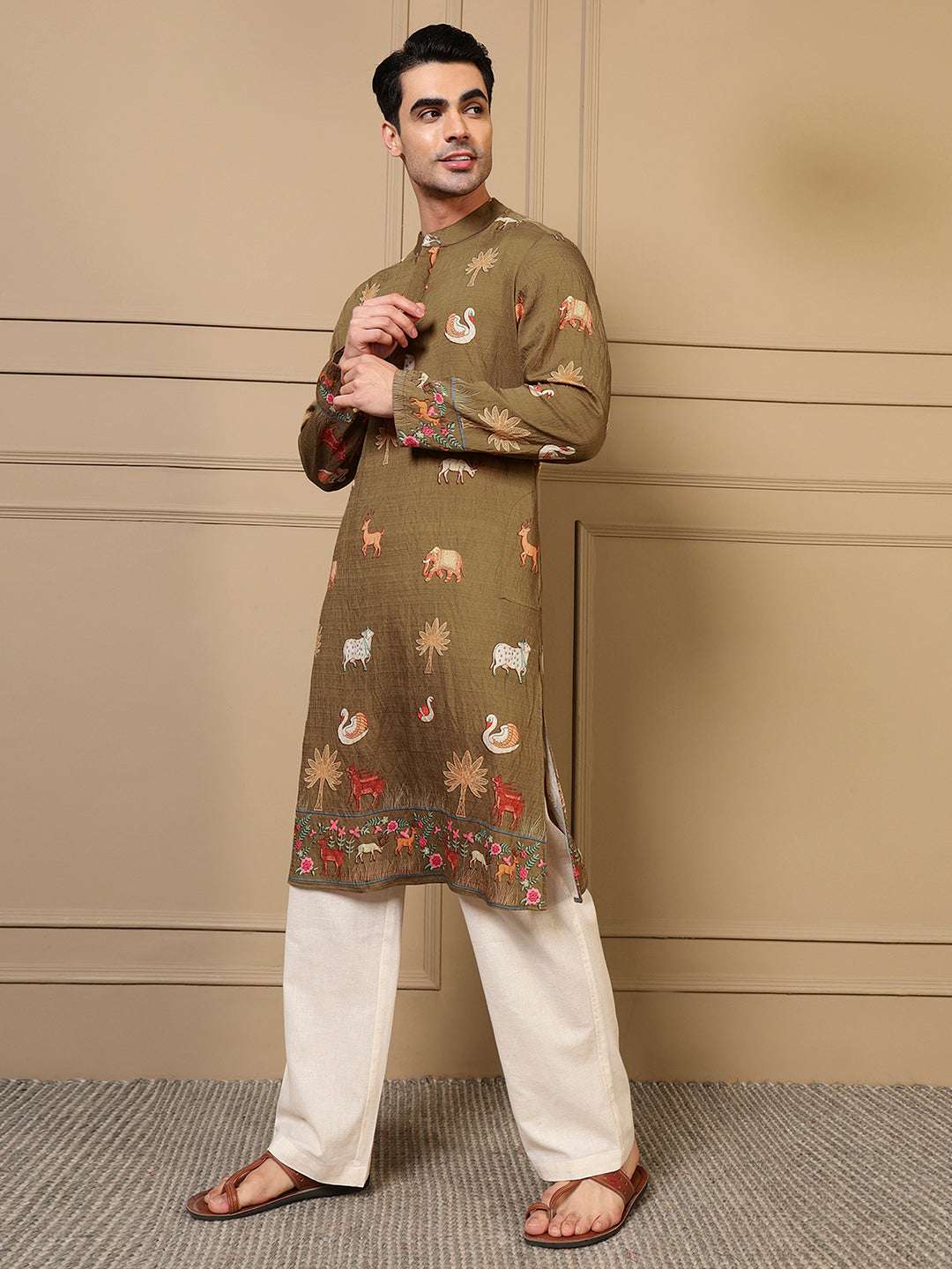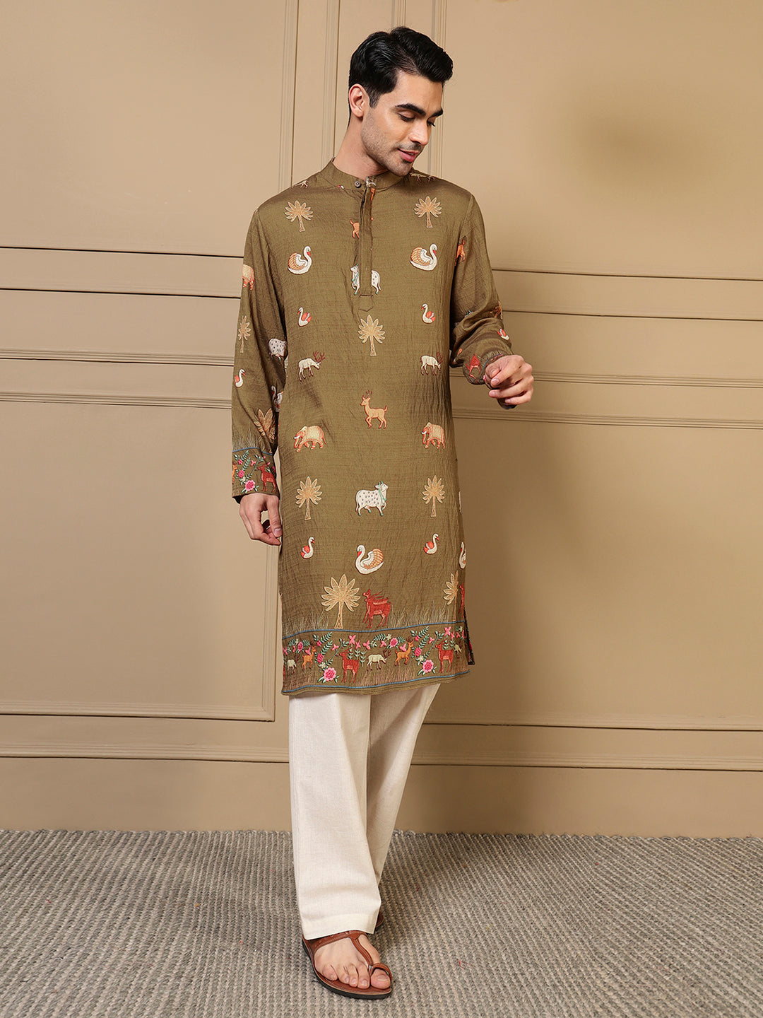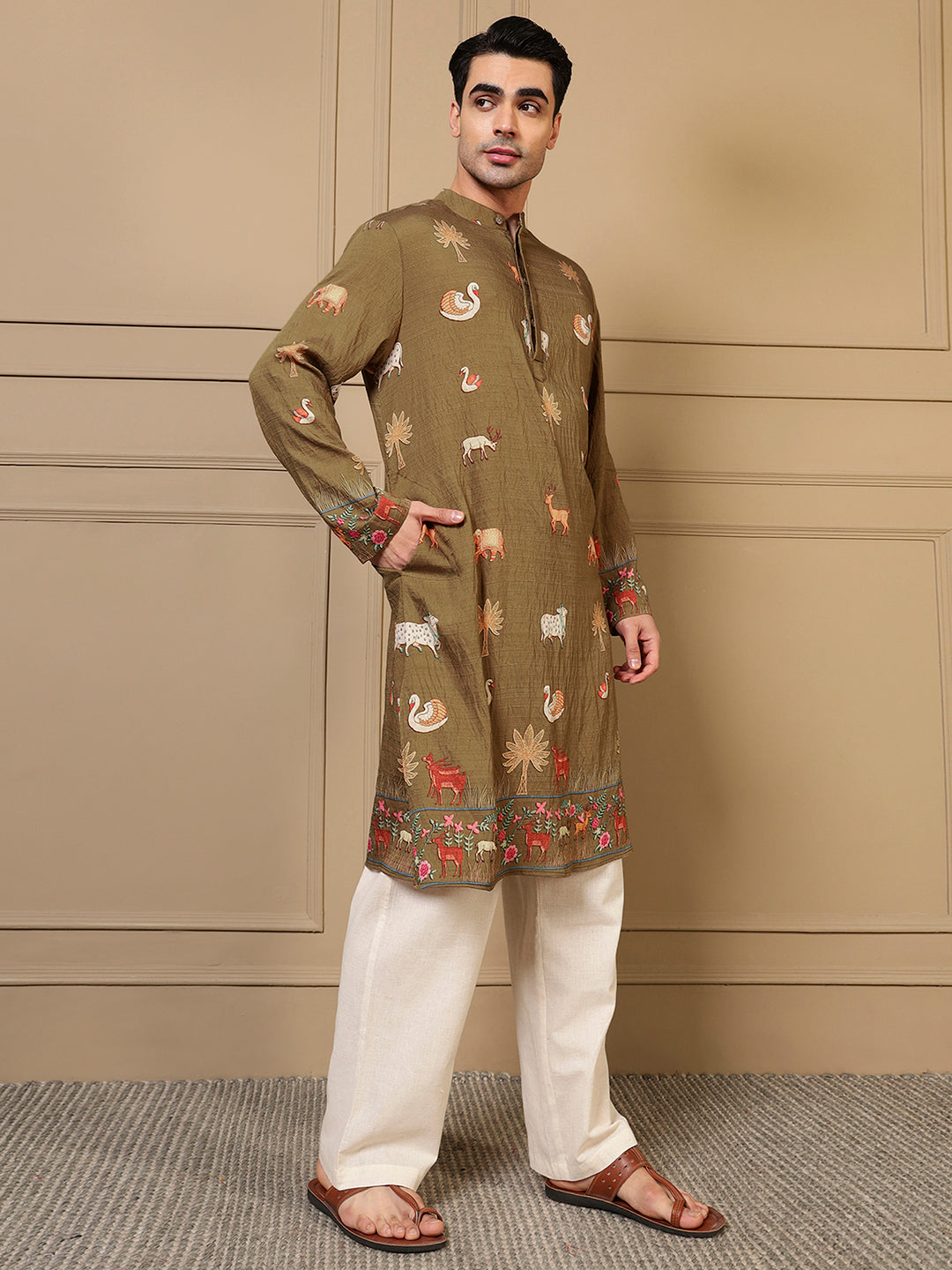 Olive Green Animal Border Printed Men Kurta