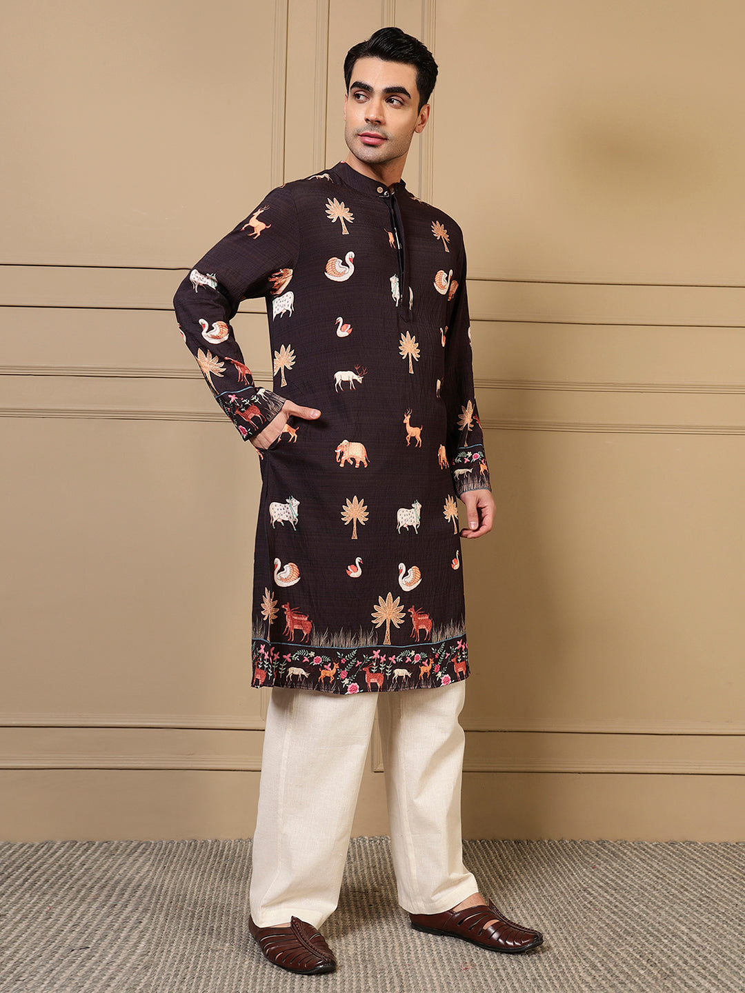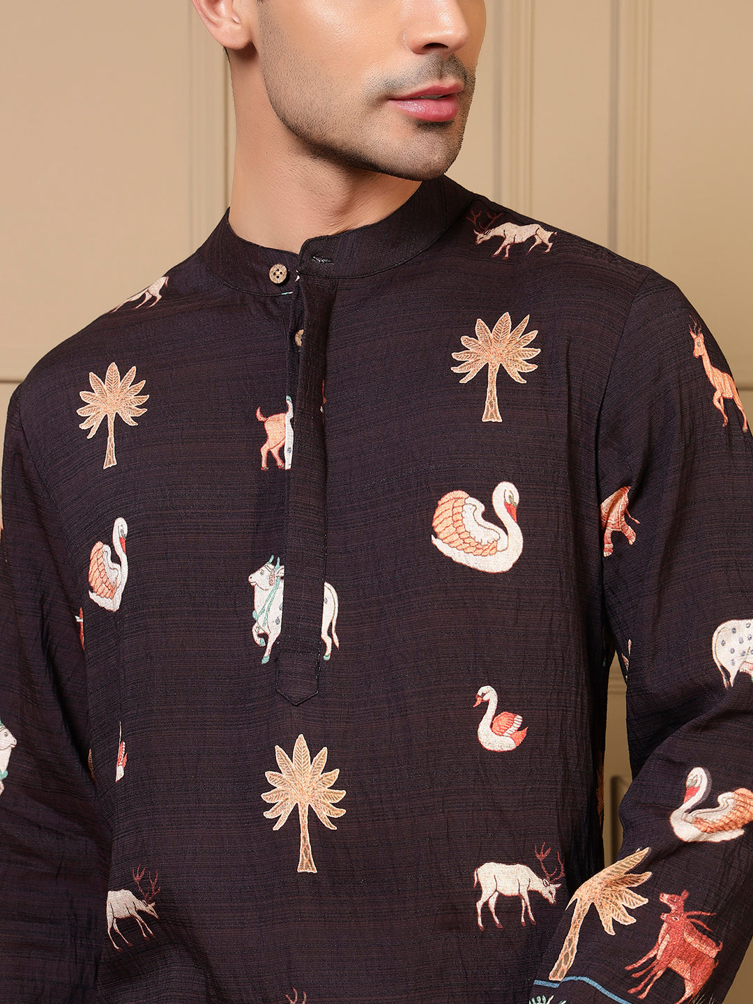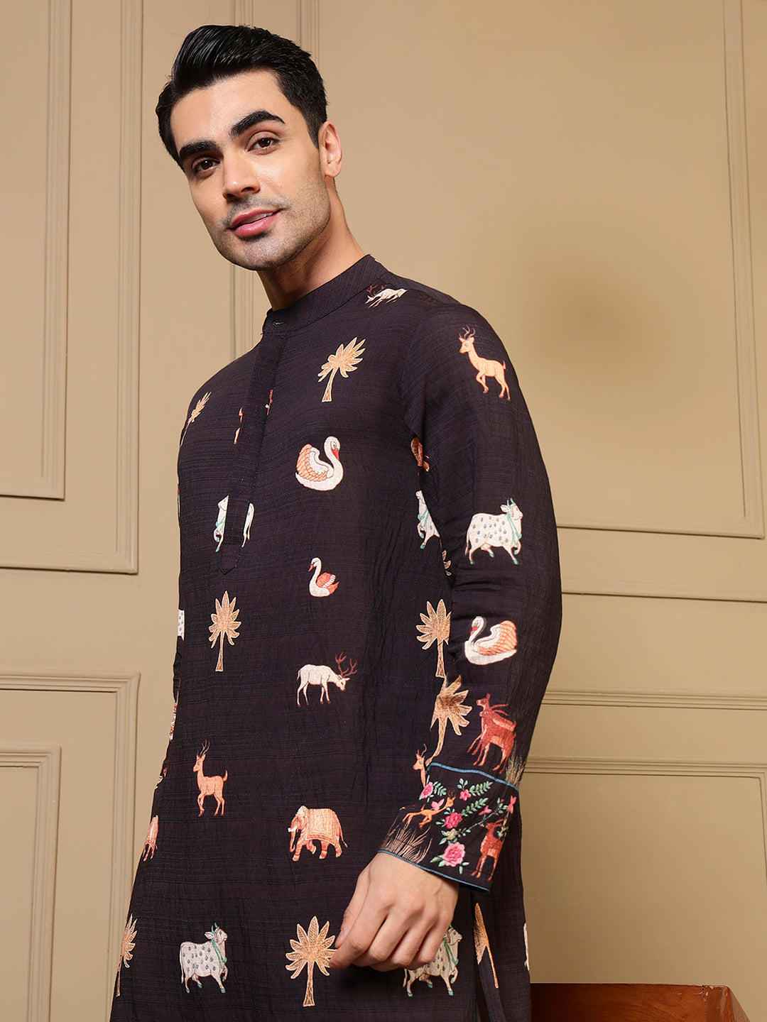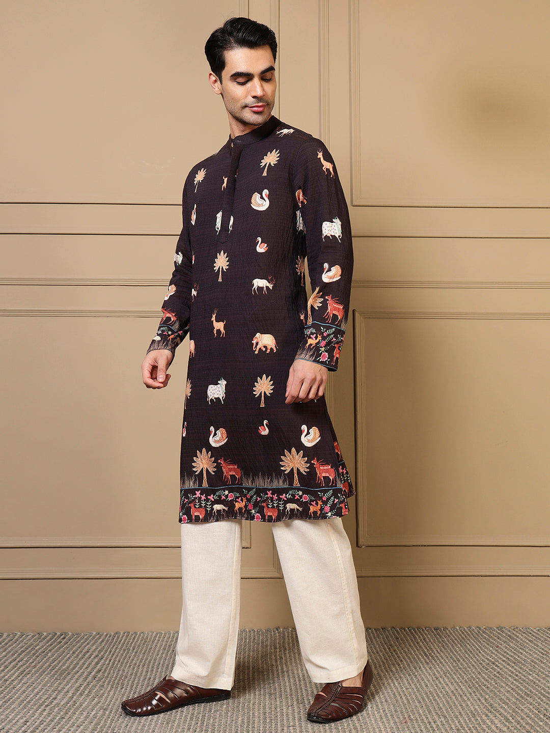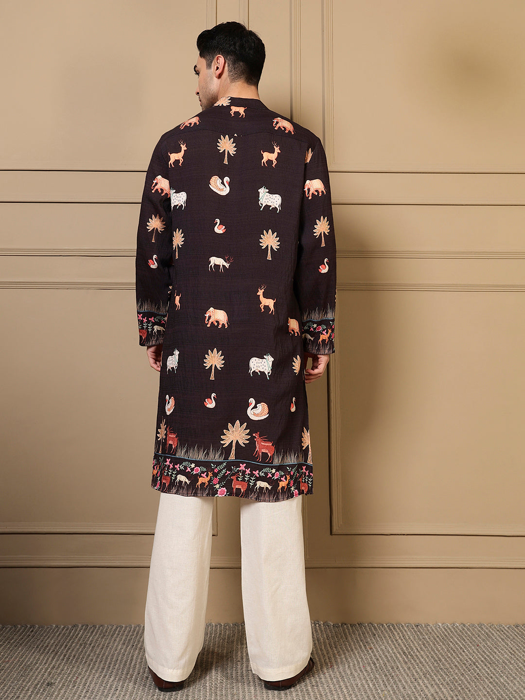 Black Animal Border Printed Men Kurta