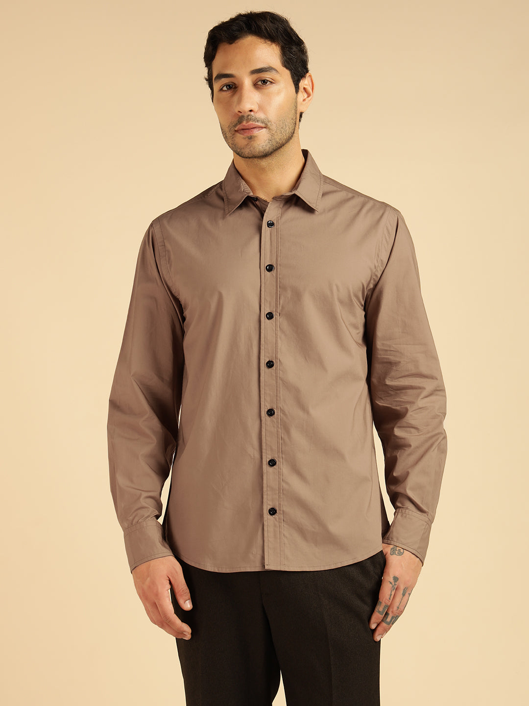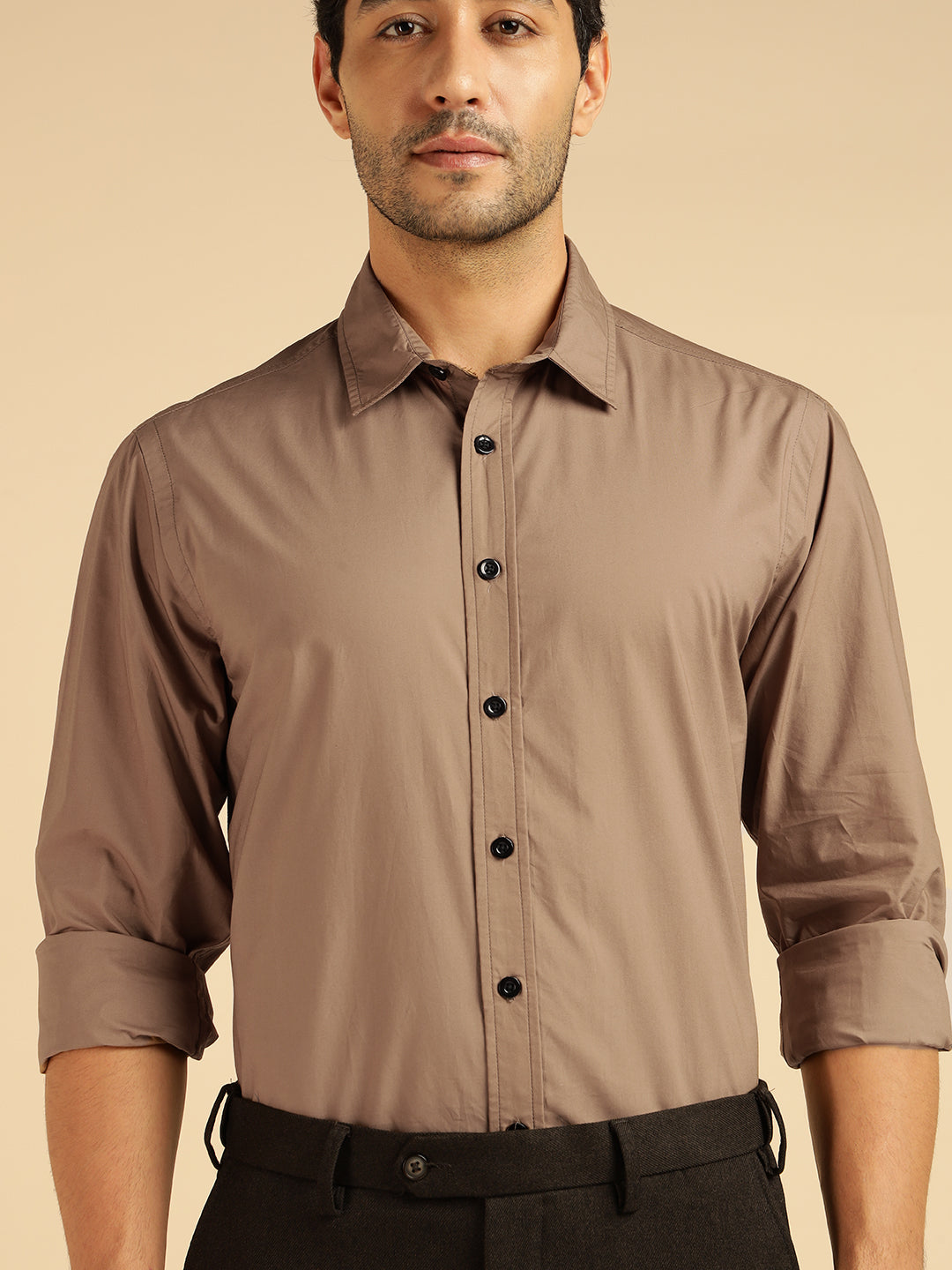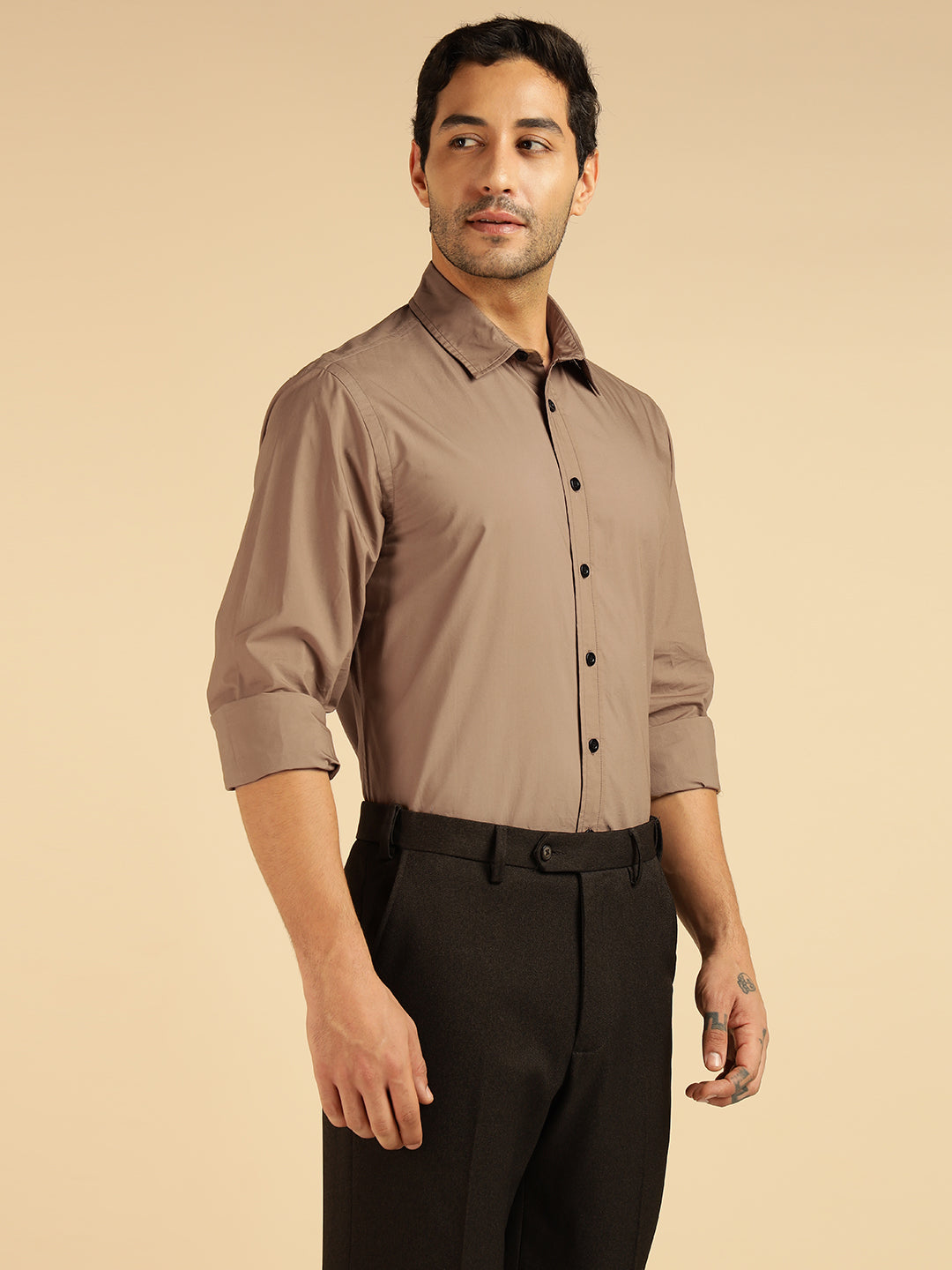 Beige Solid Pure Cotton Men Formal Shirt