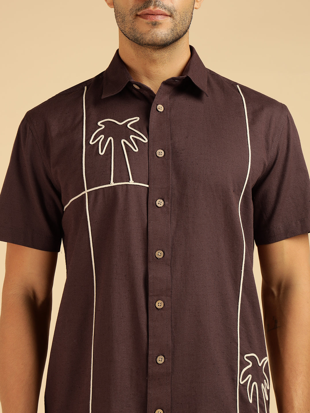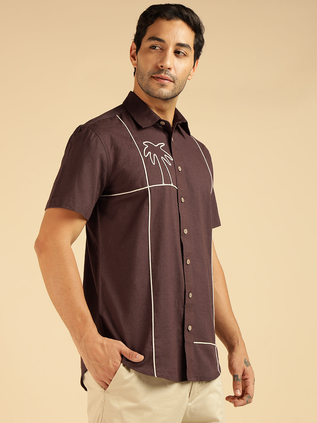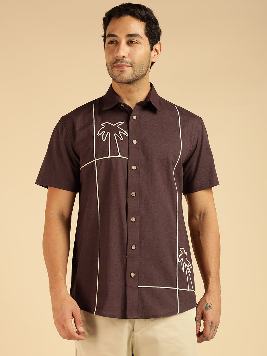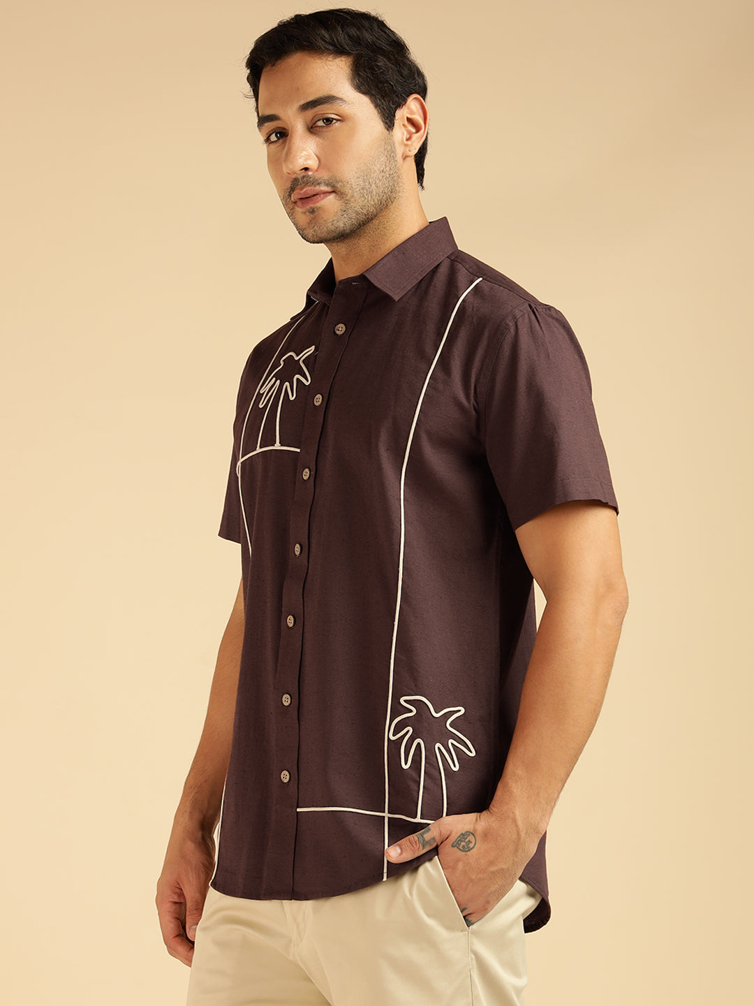 Brown Embroidered Pure Cotton Men Casual Shirt