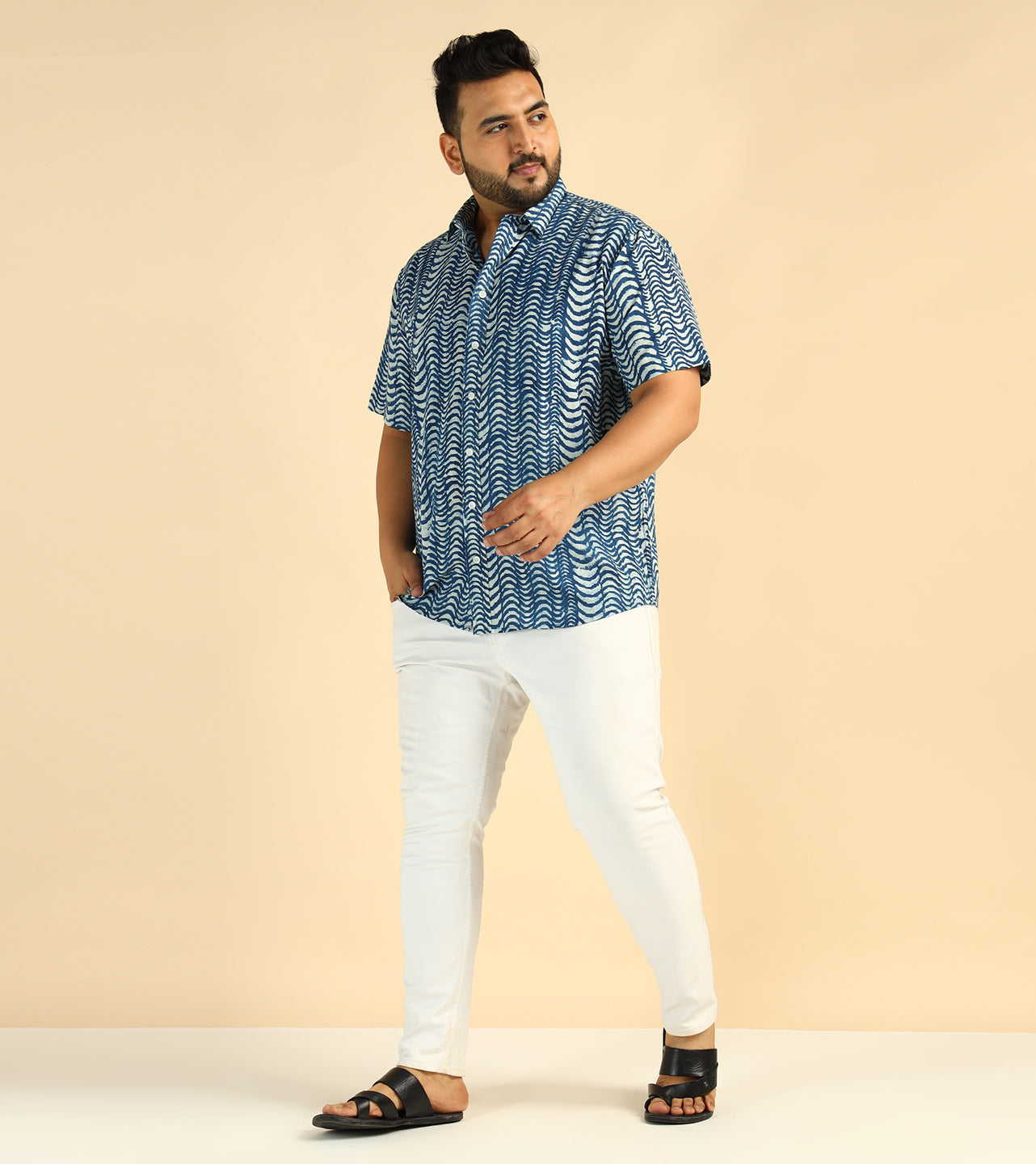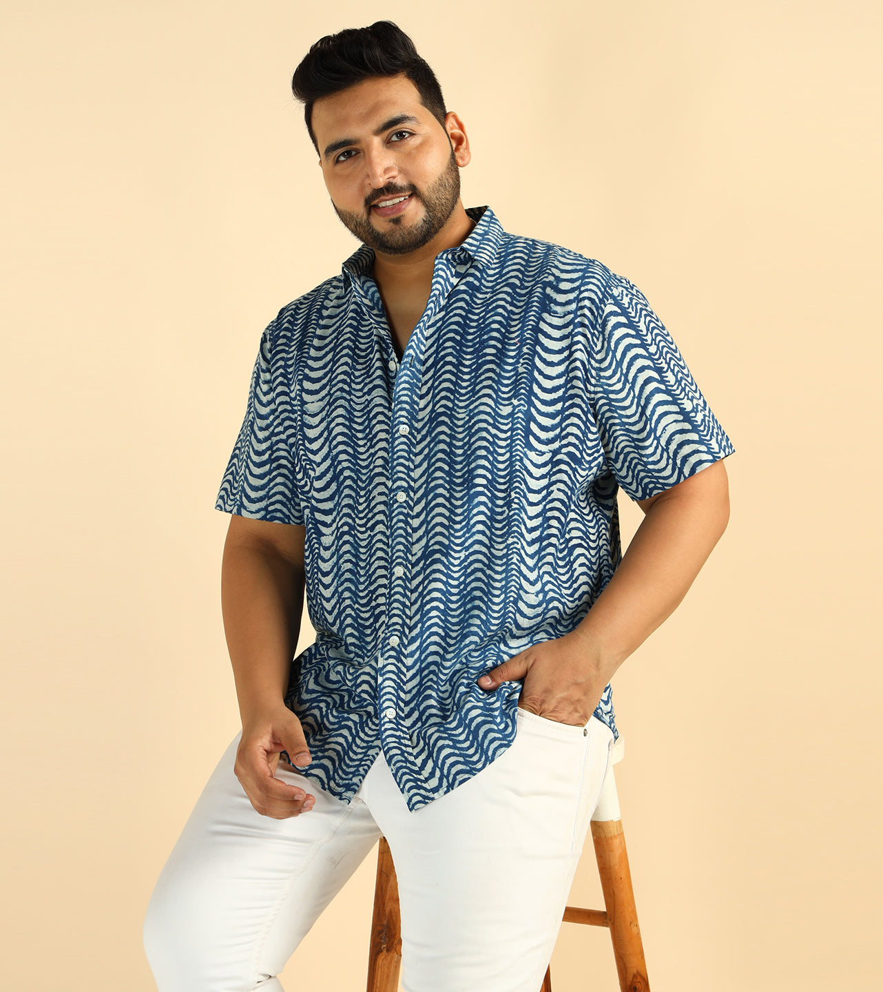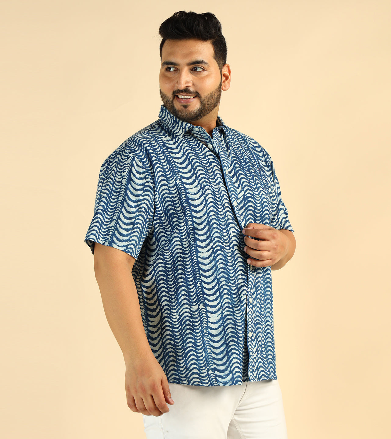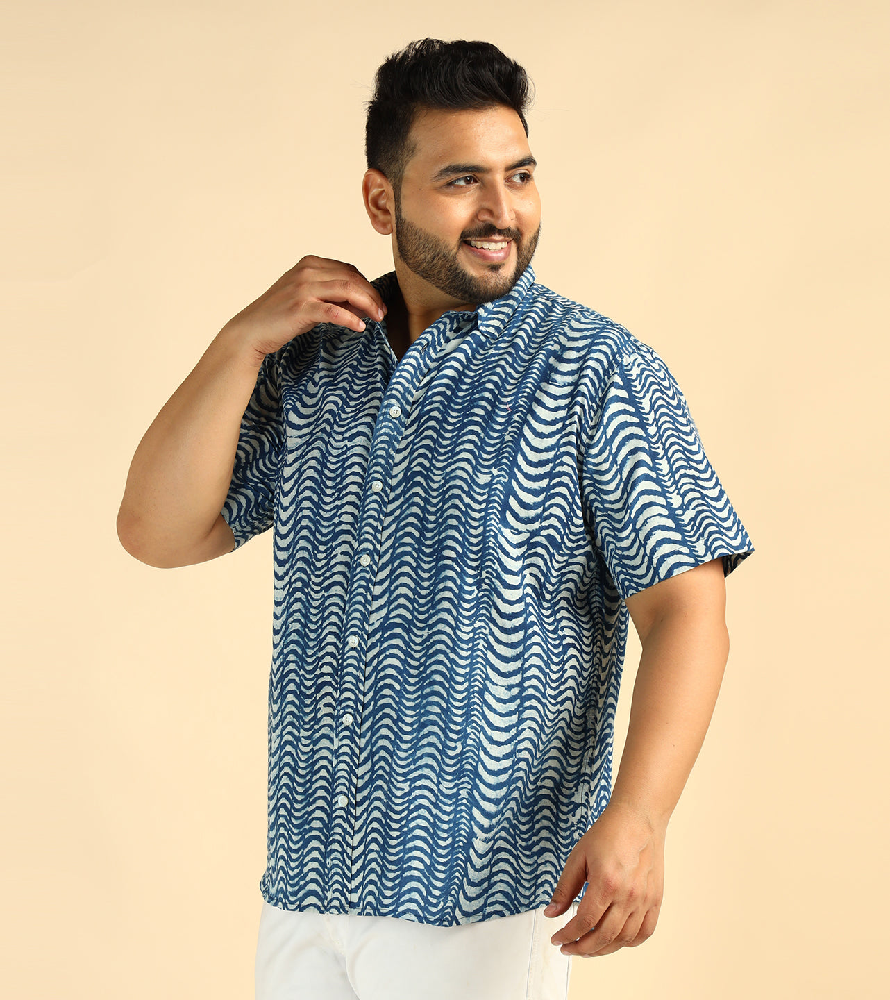 Cotton Wave Printed Plus Size Casual Indigo Men Shirt