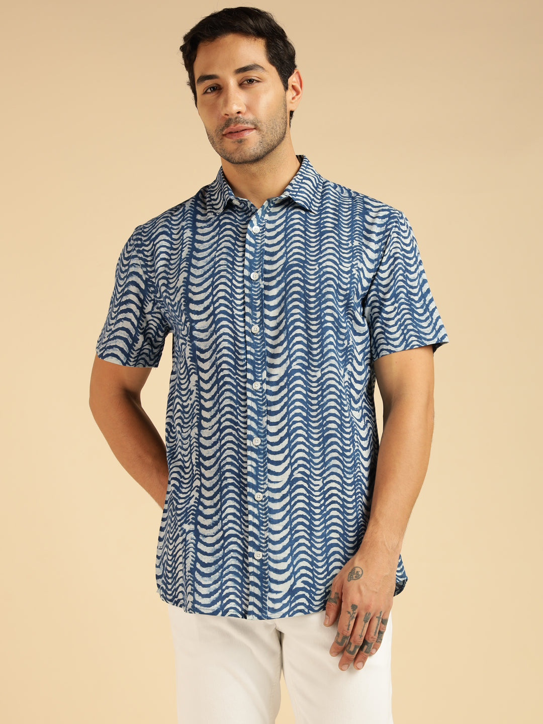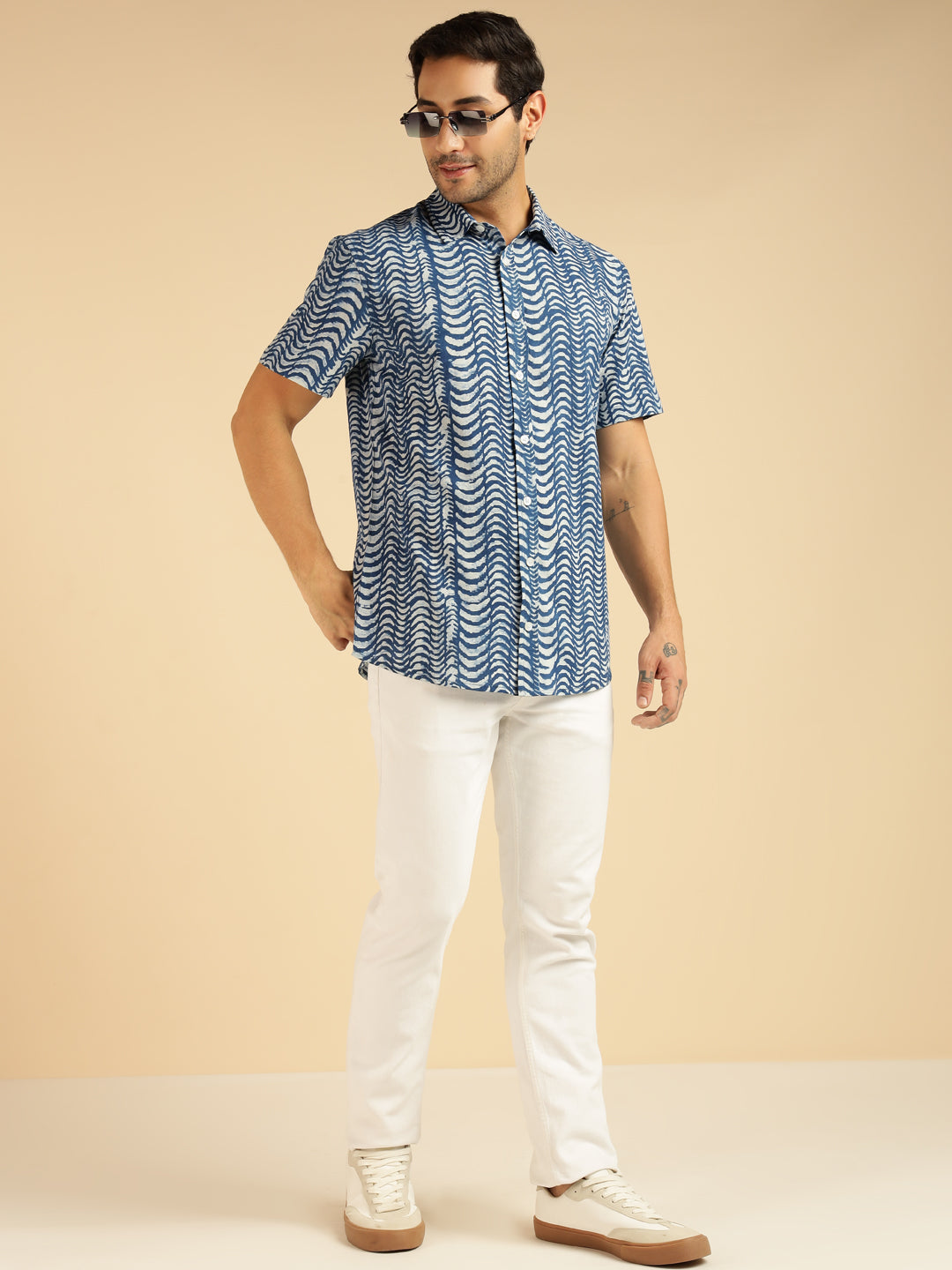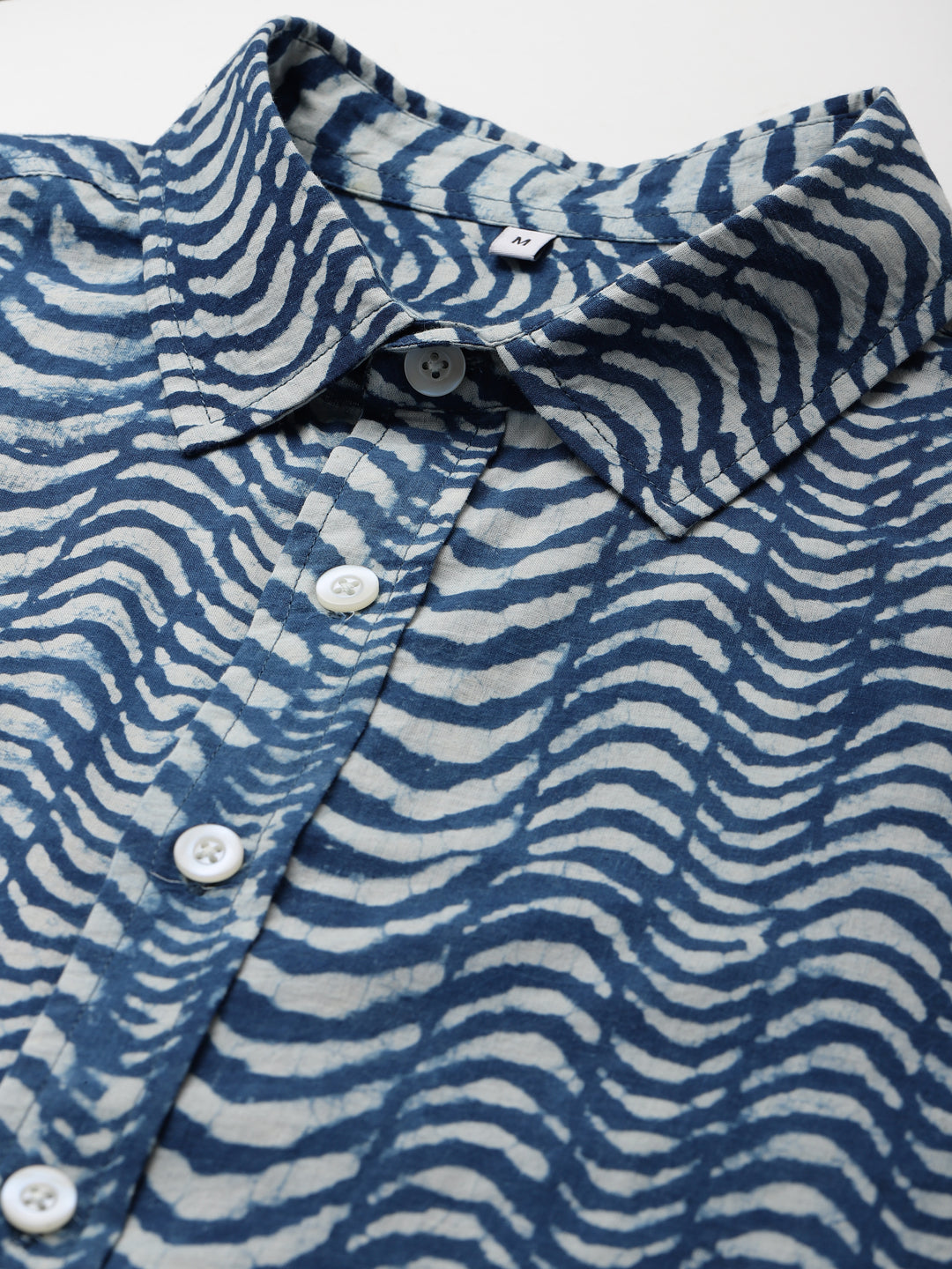 Indigo Pure Cotton Wave Printed Men Casual Shirt