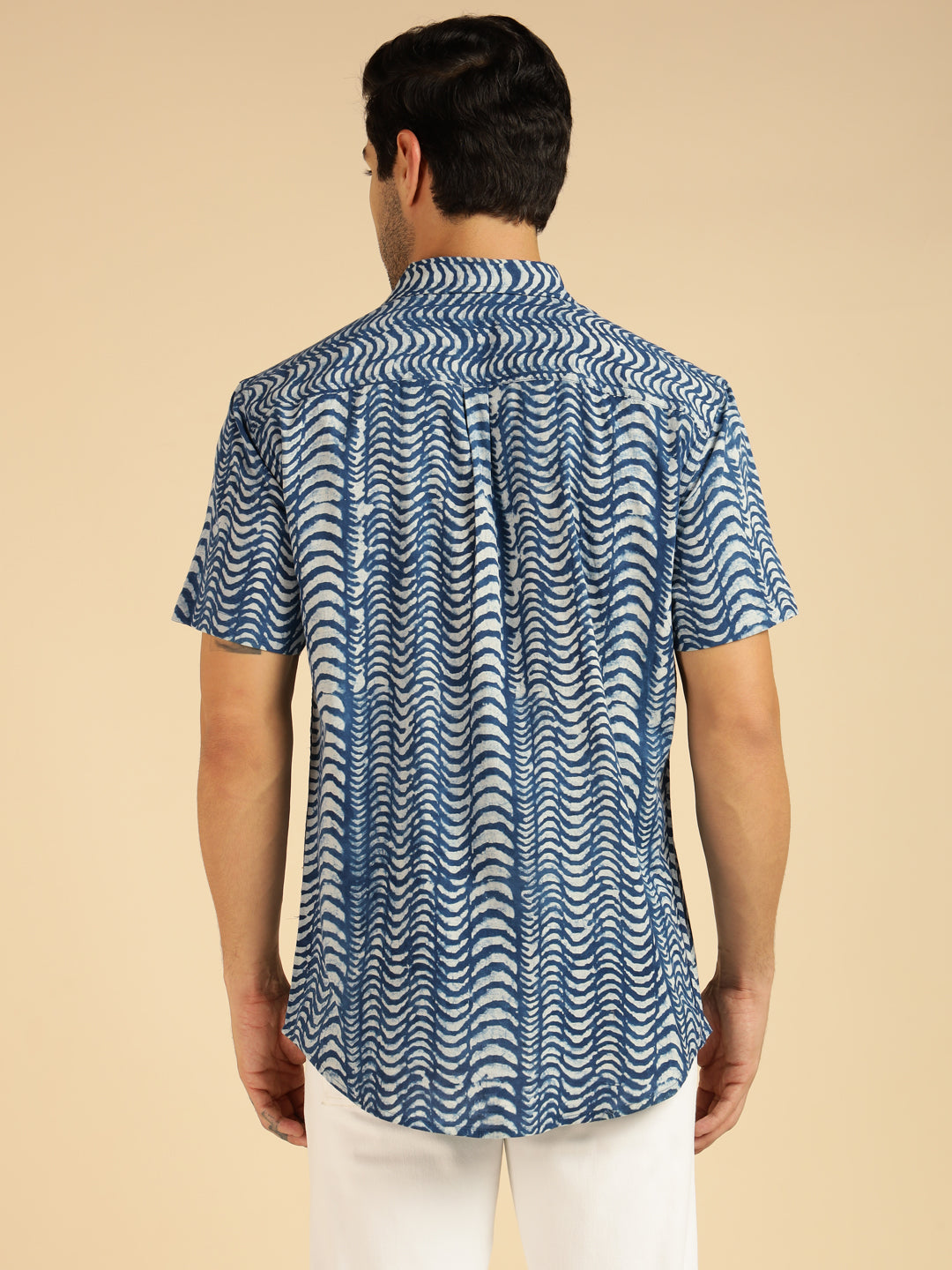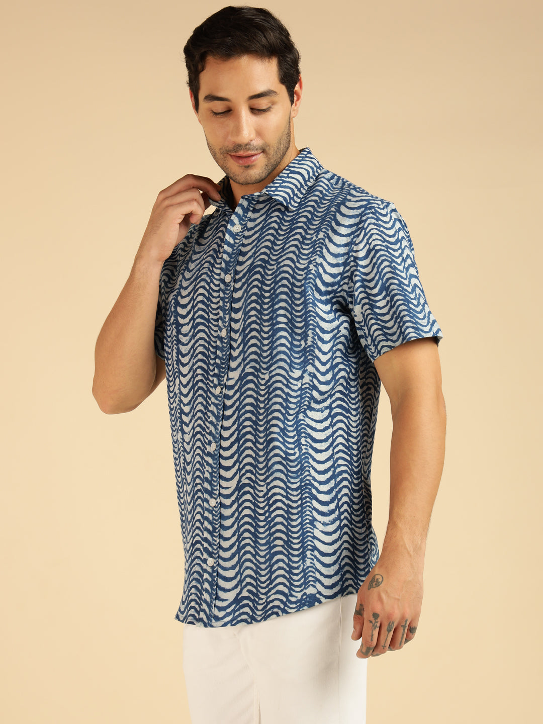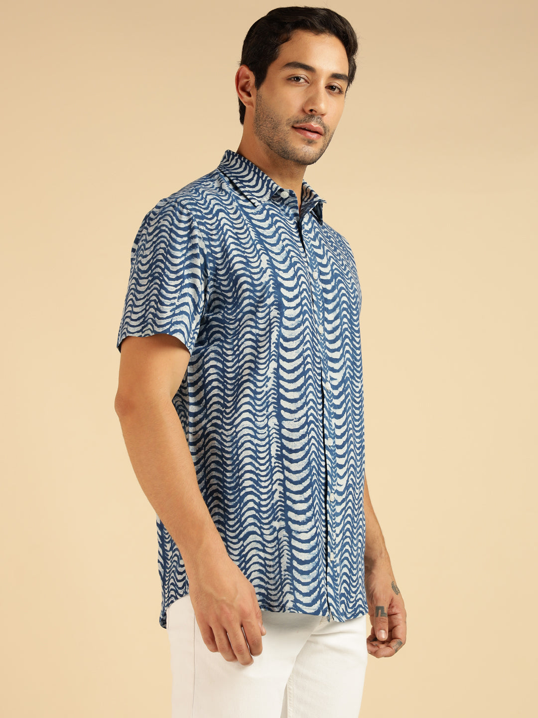 Indigo Pure Cotton Wave Printed Men Casual Shirt