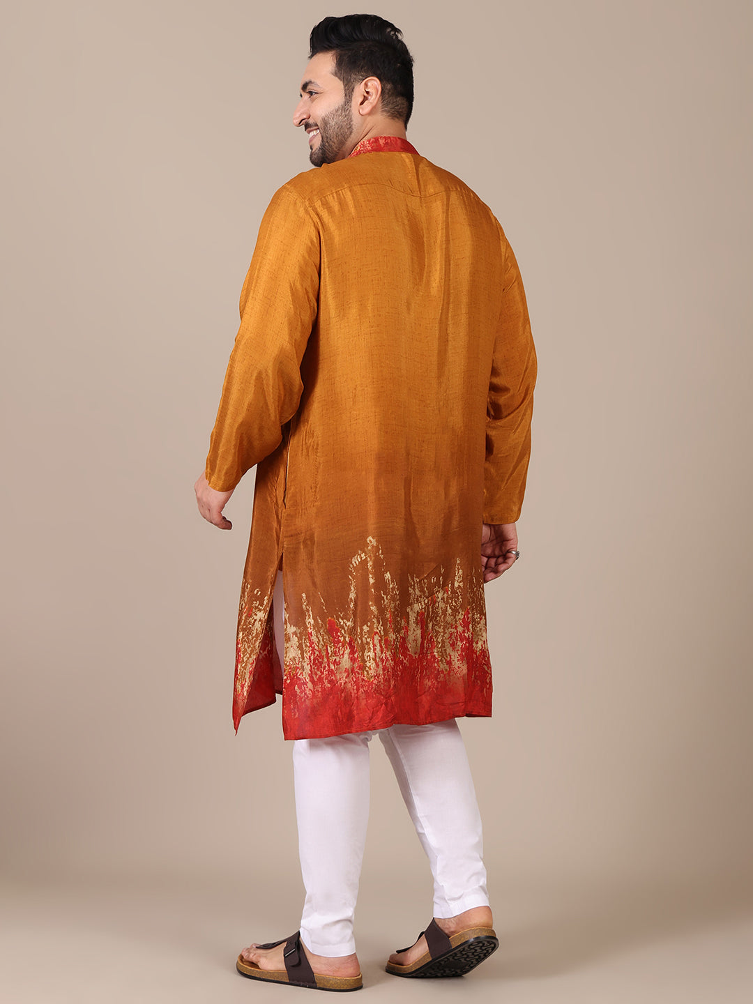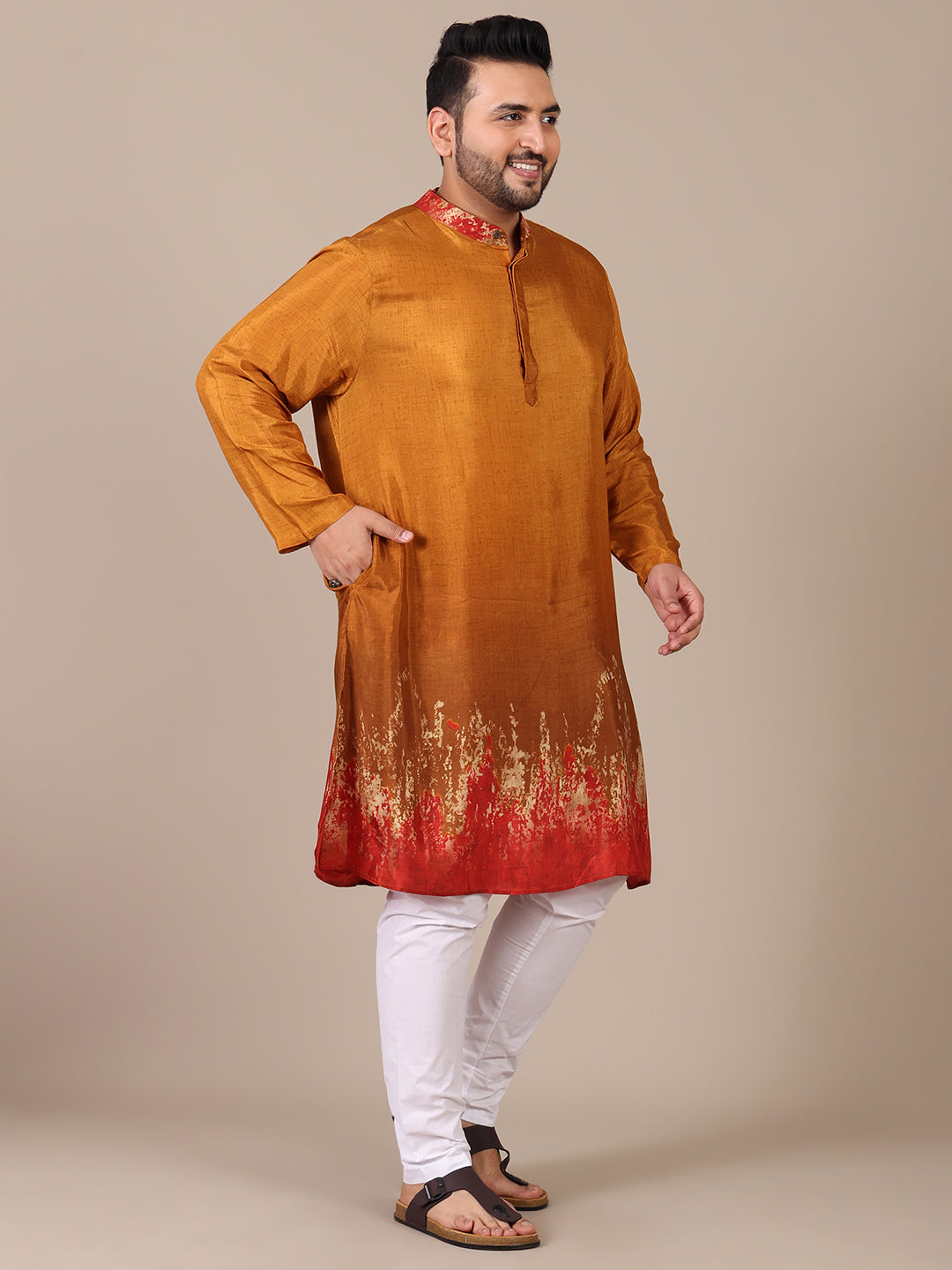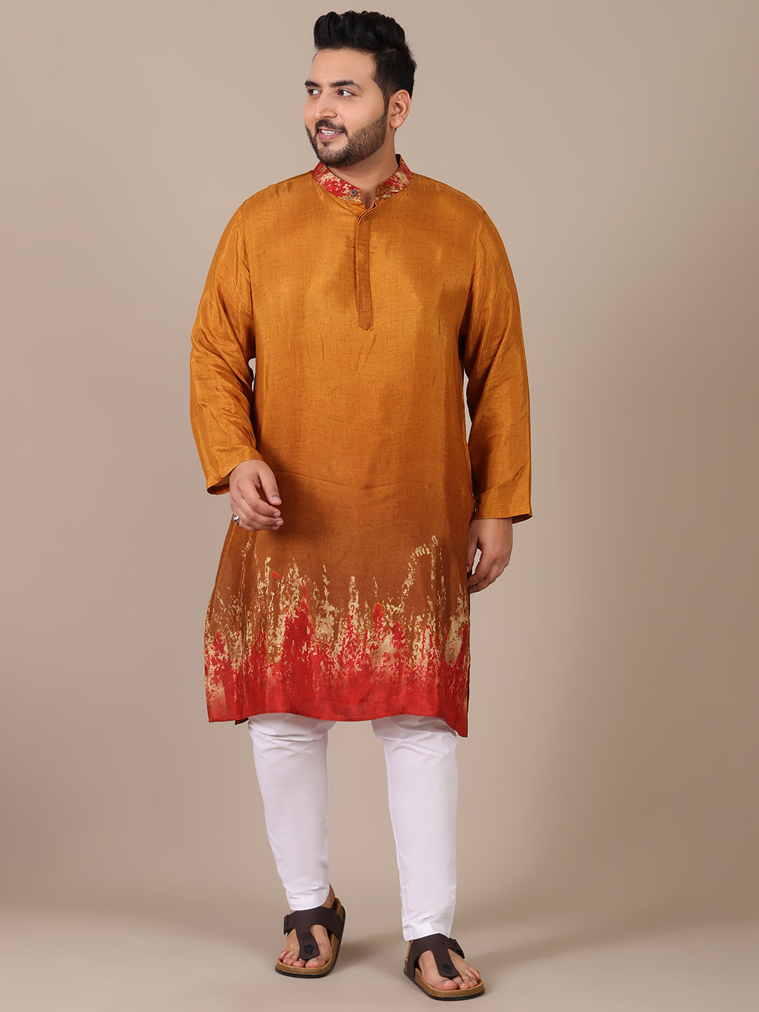 Mustard Tie Dye Pure Muslin Collared Plus Size Kurta For Men