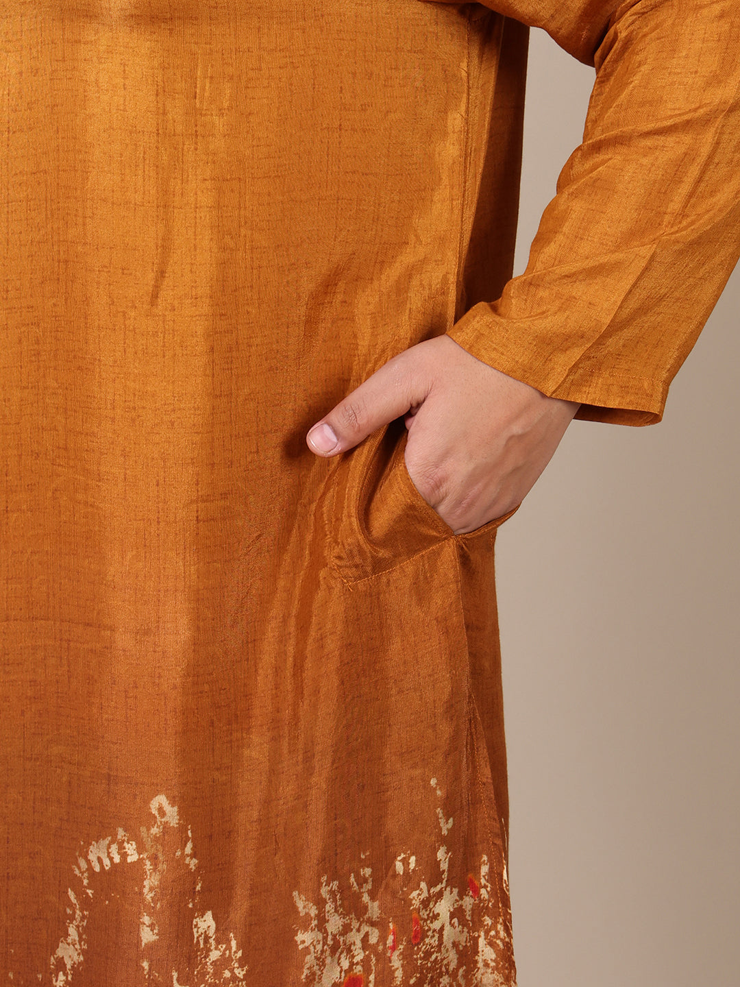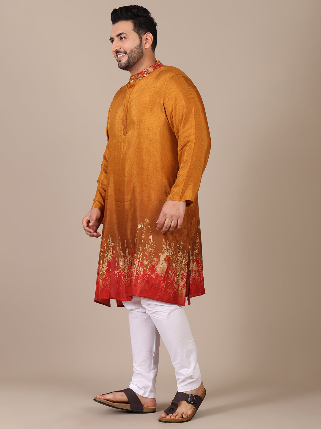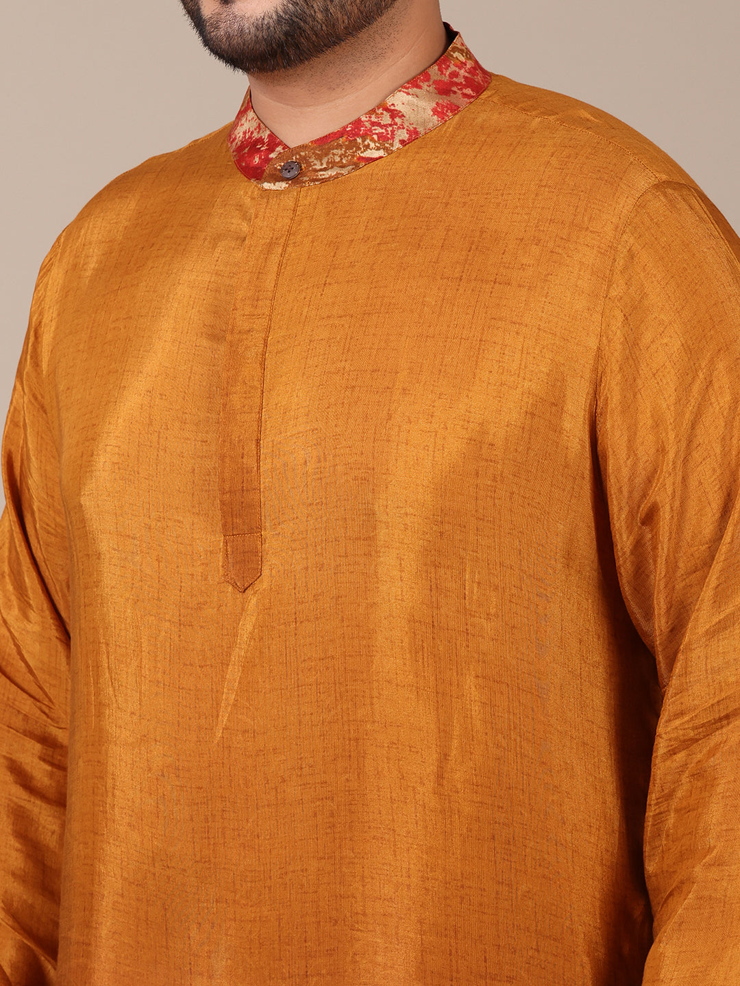 Mustard Tie Dye Pure Muslin Collared Plus Size Kurta For Men
