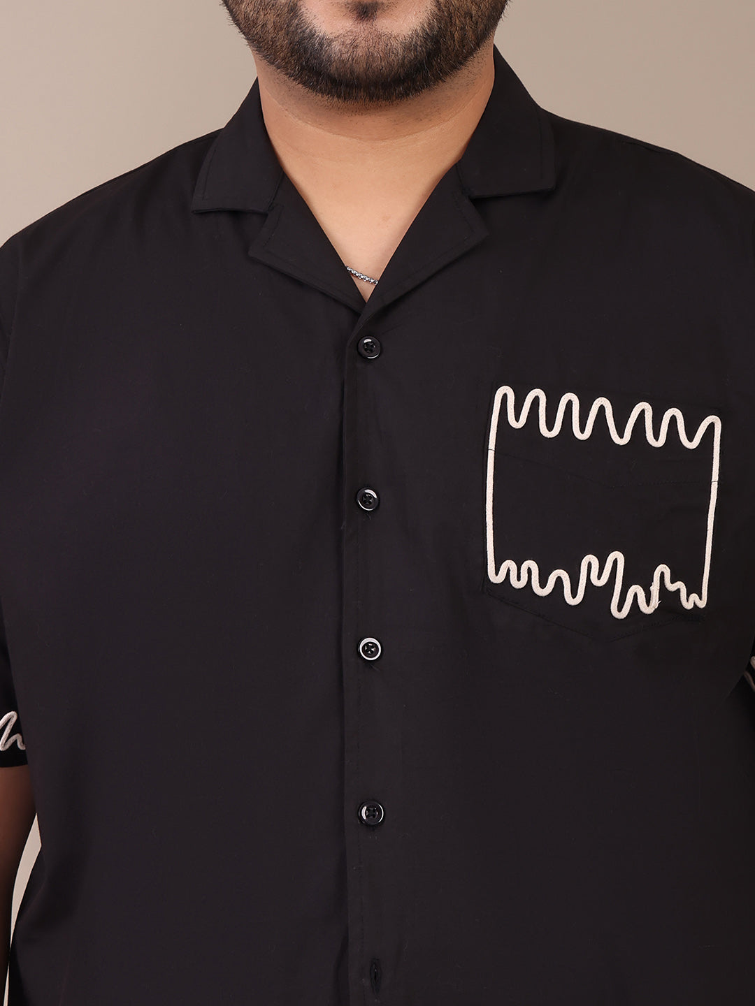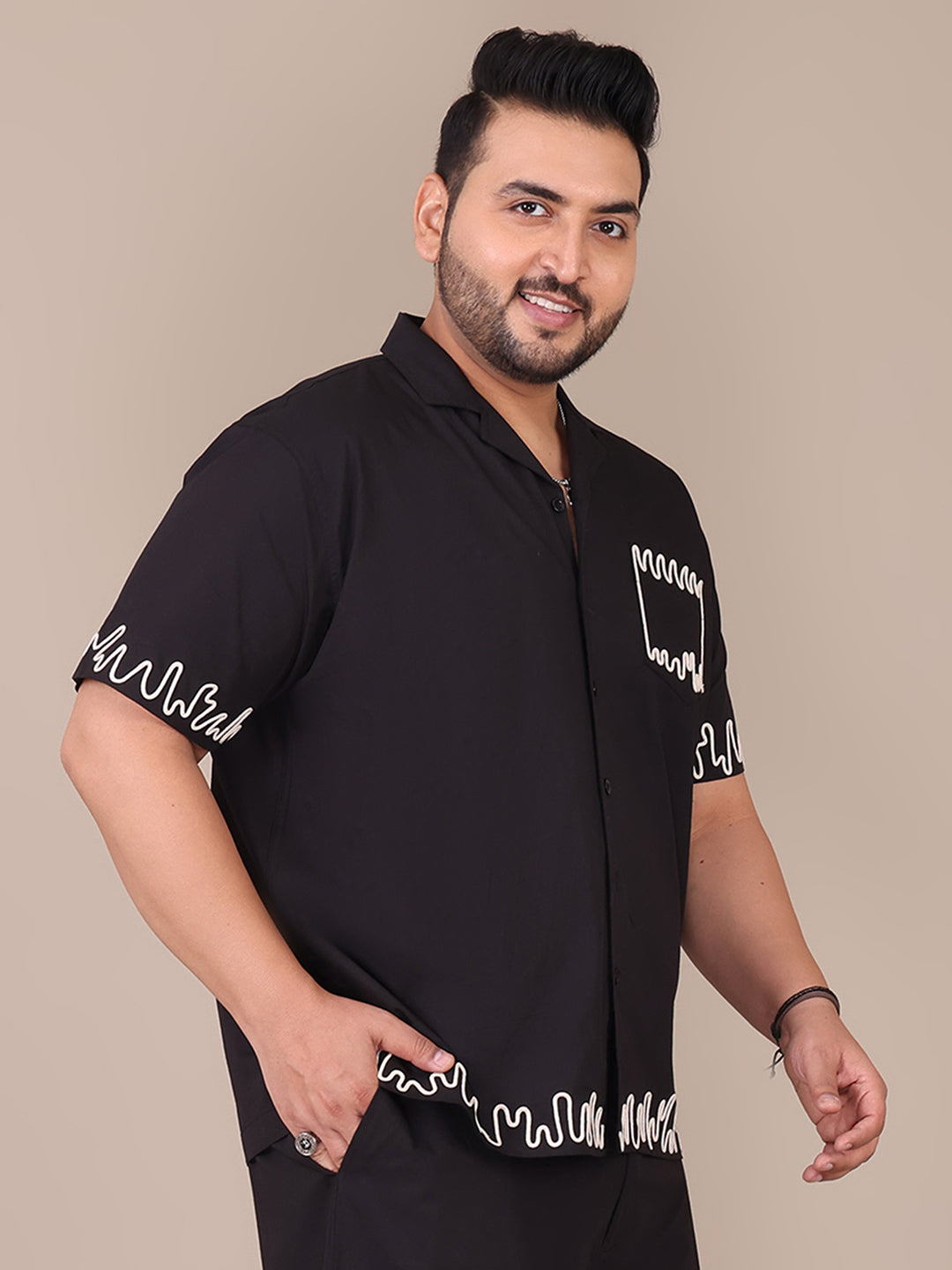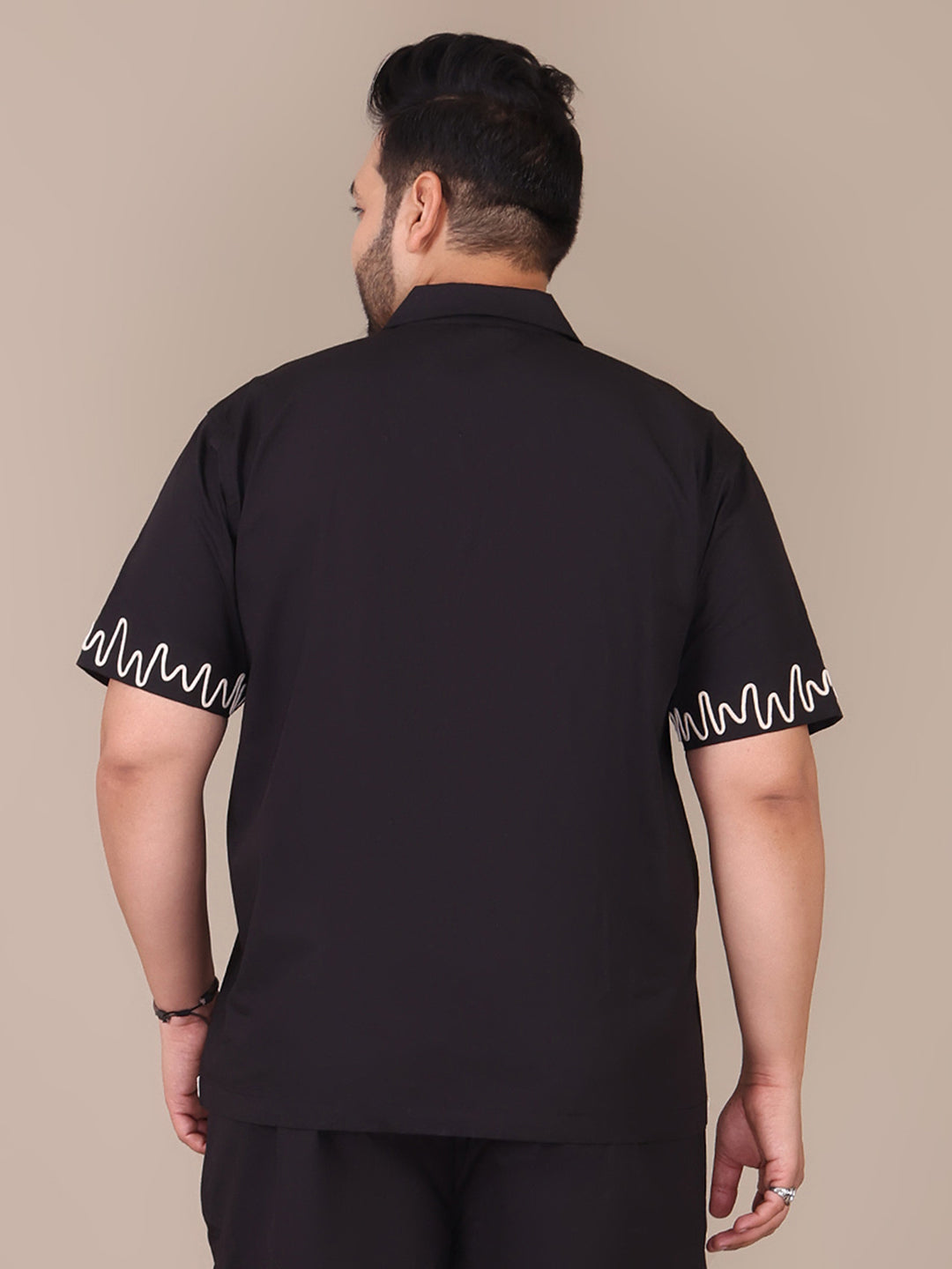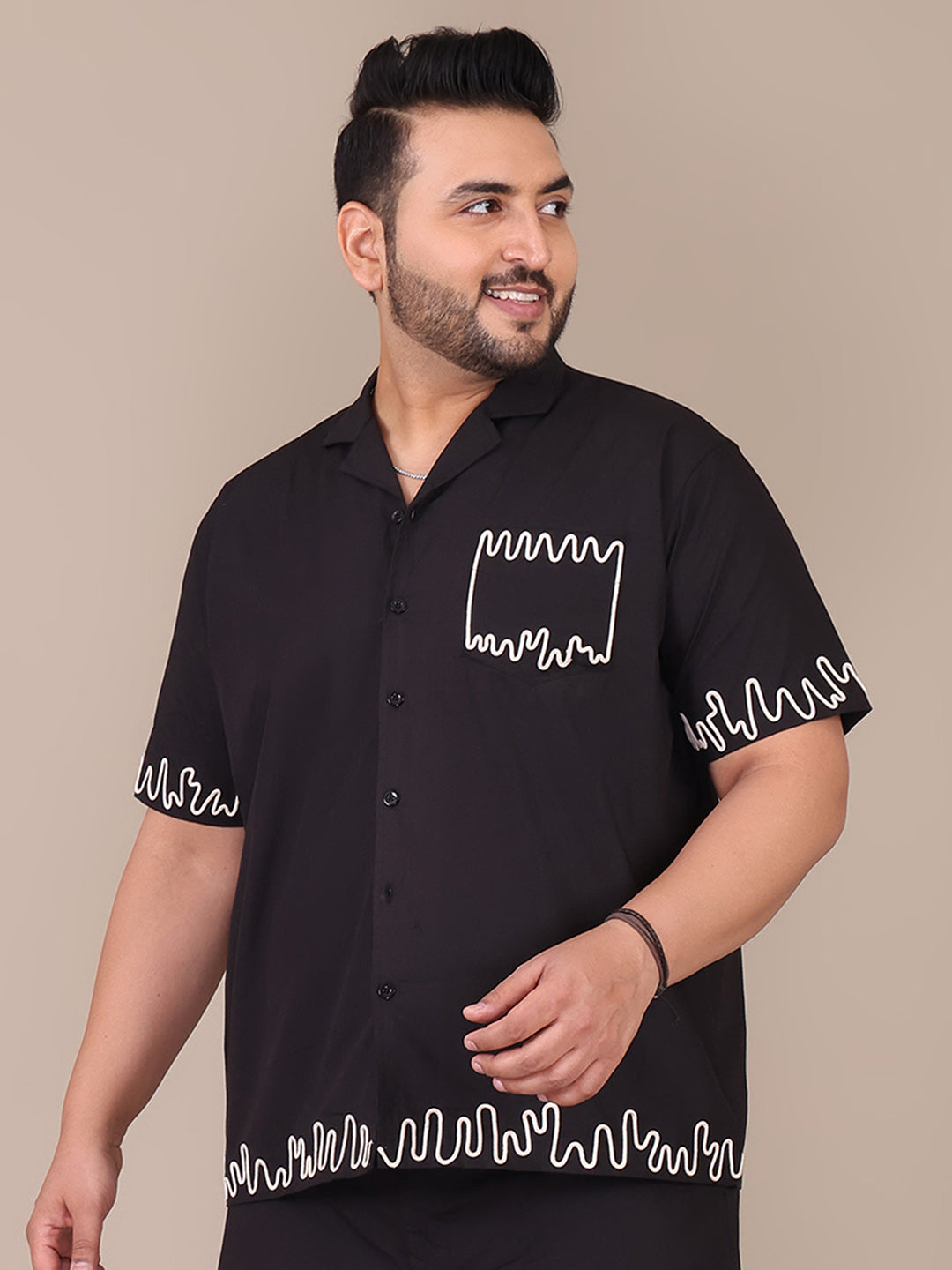 Pure Cotton Black Notch Collared Embroidered Casual Plus Size Shirt For Men