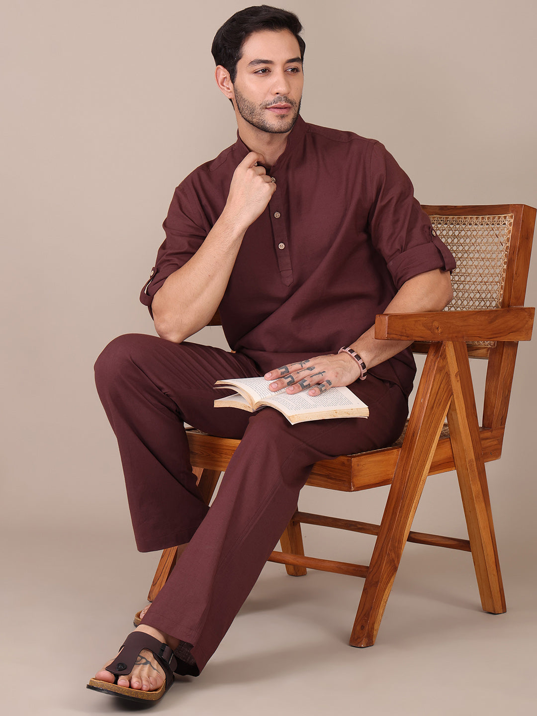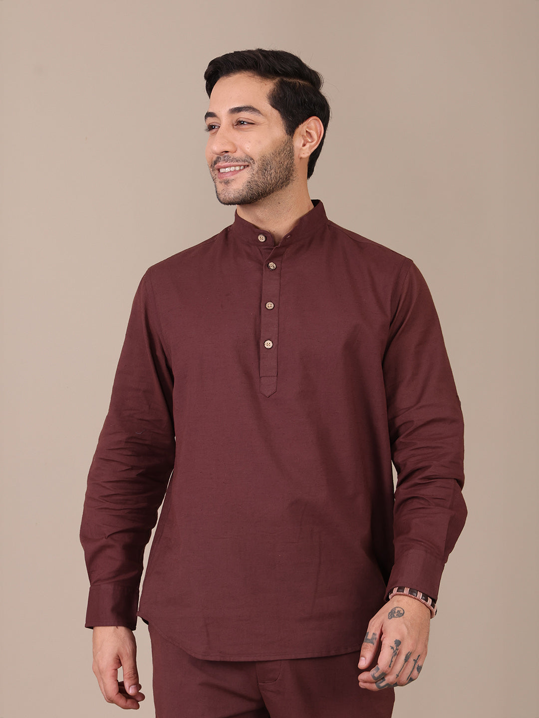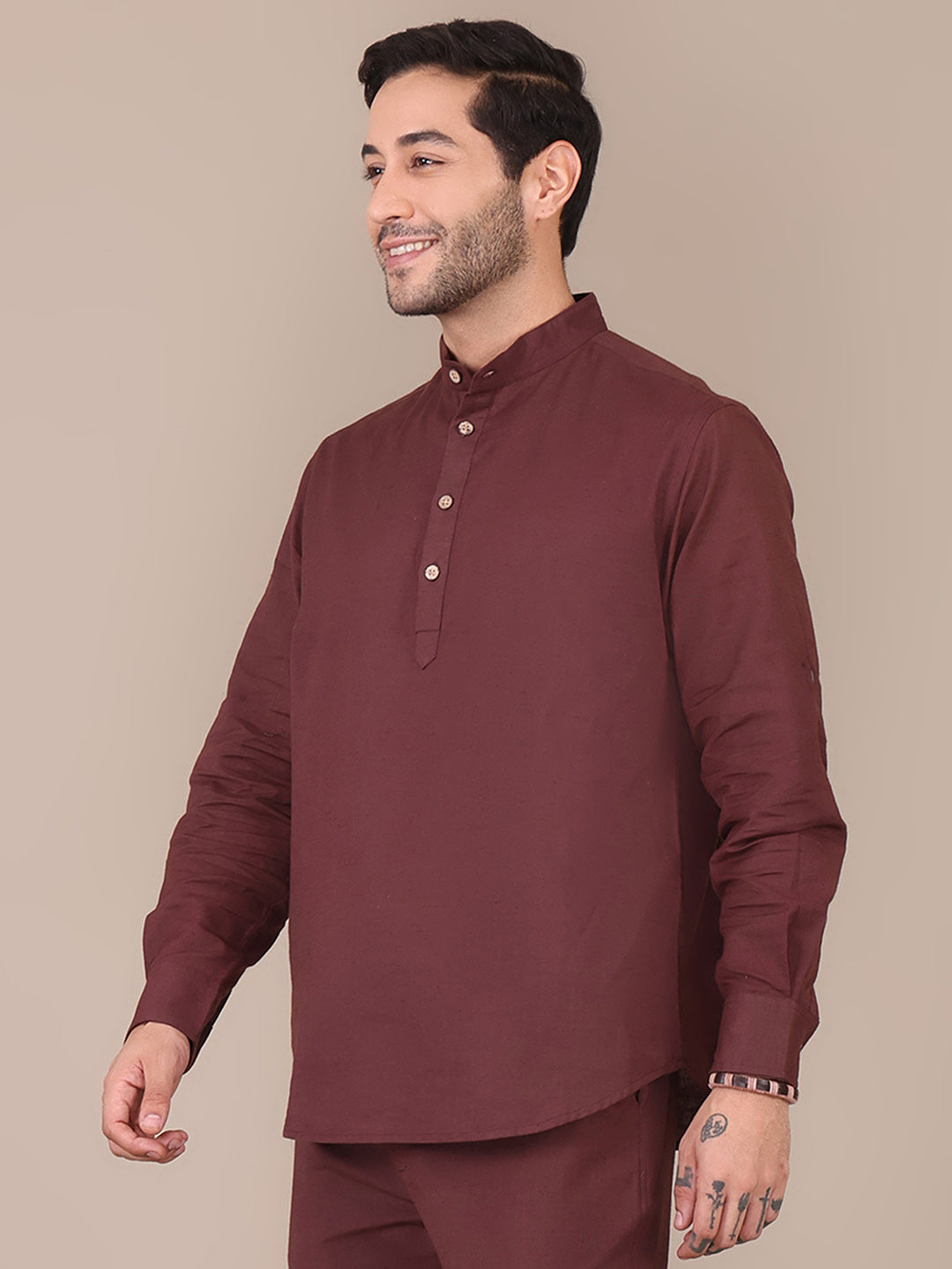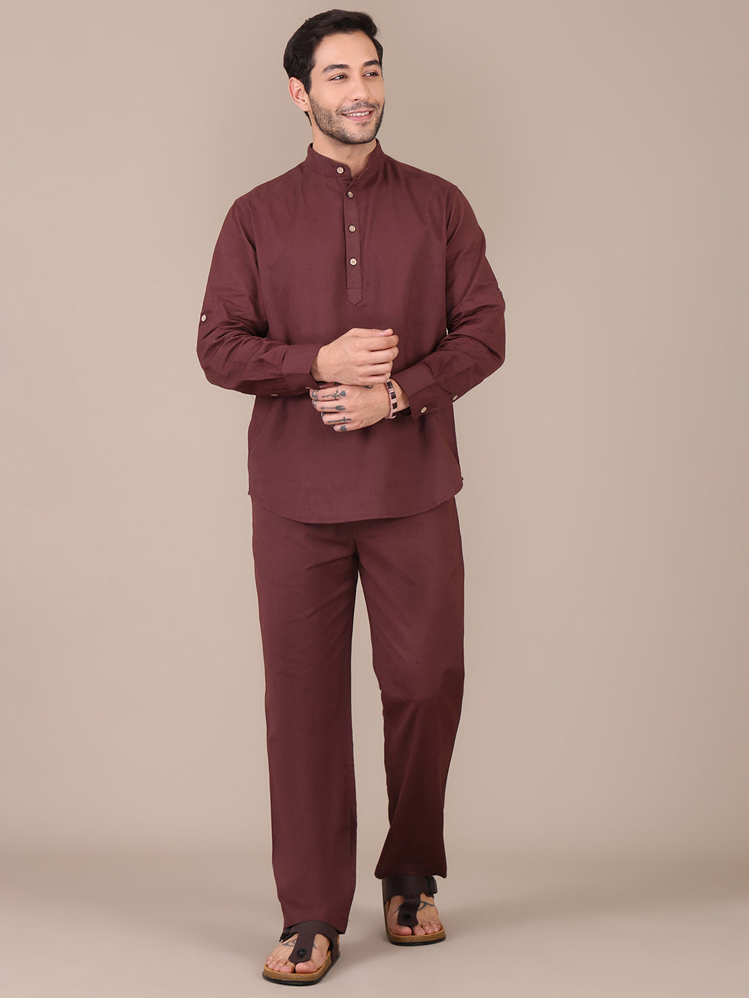 Pure Cotton Brown Mandarin Collar Kurta For Men