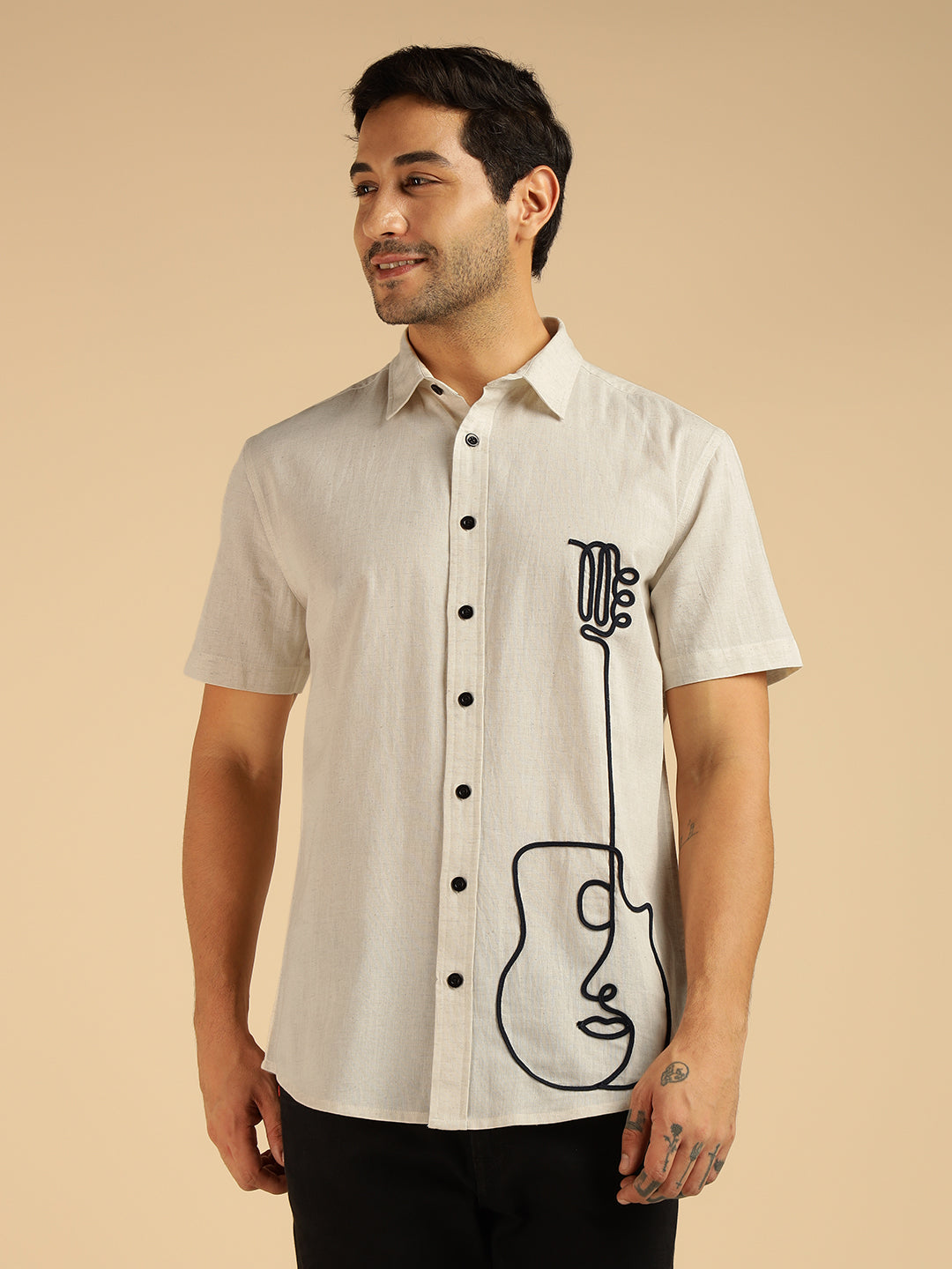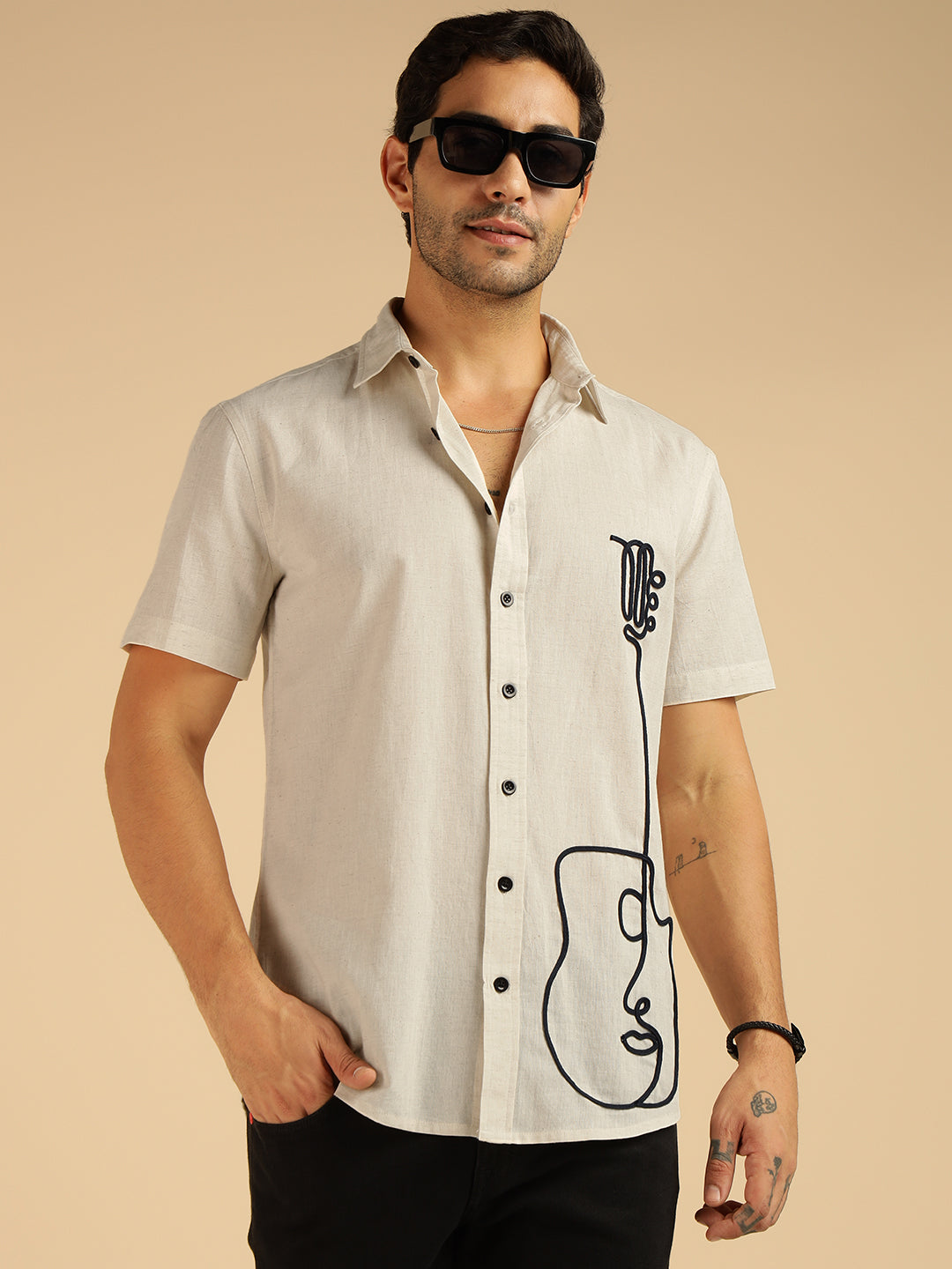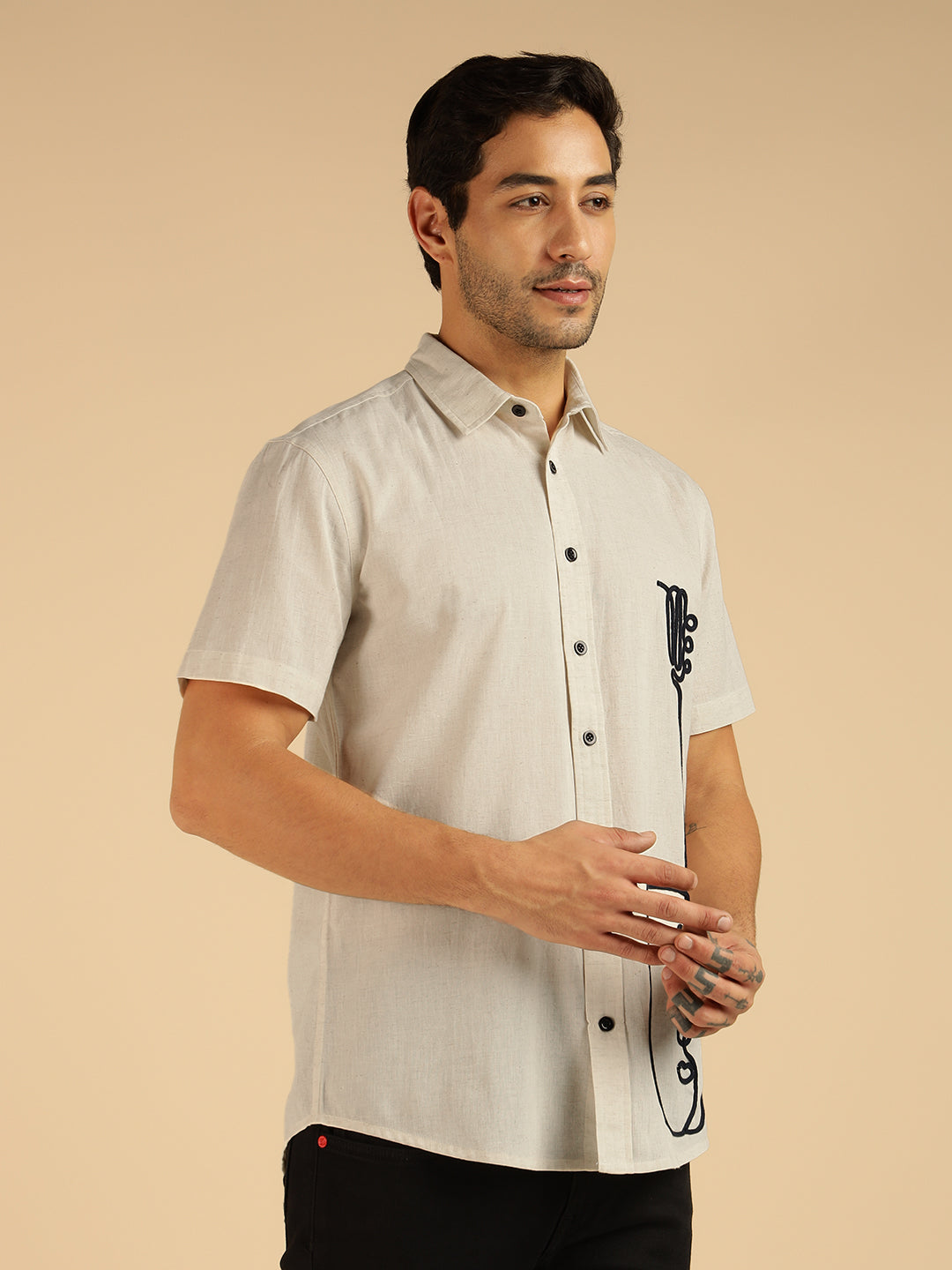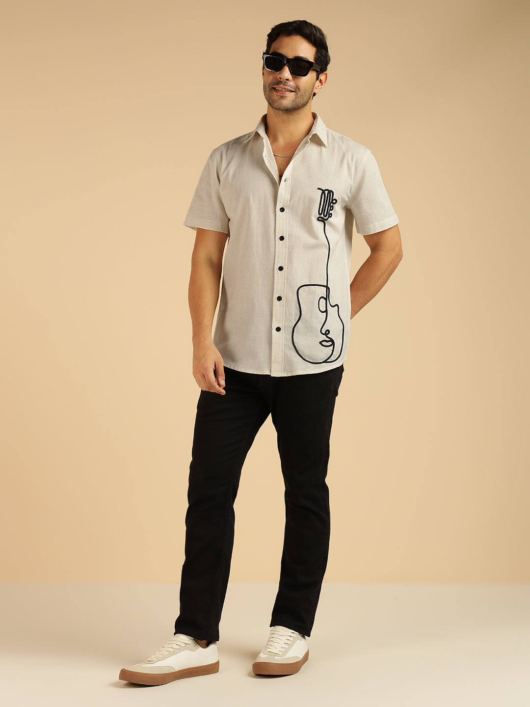 Pure Cotton Off White Embroidered Men Casual Shirt