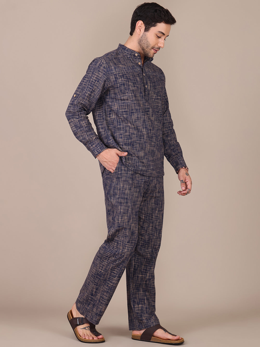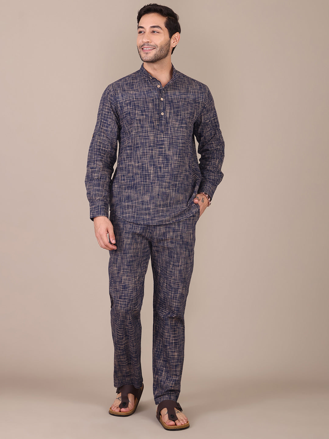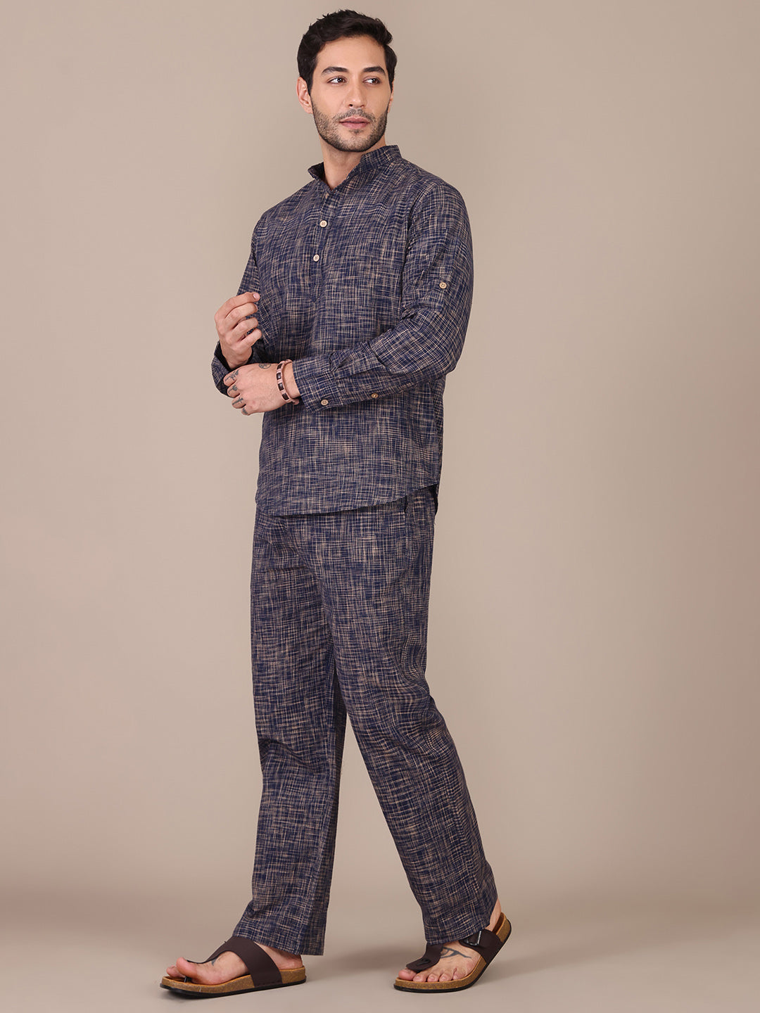 Pure Khadi Navy Blue Mandarin Collar Co-Ord Set For Men