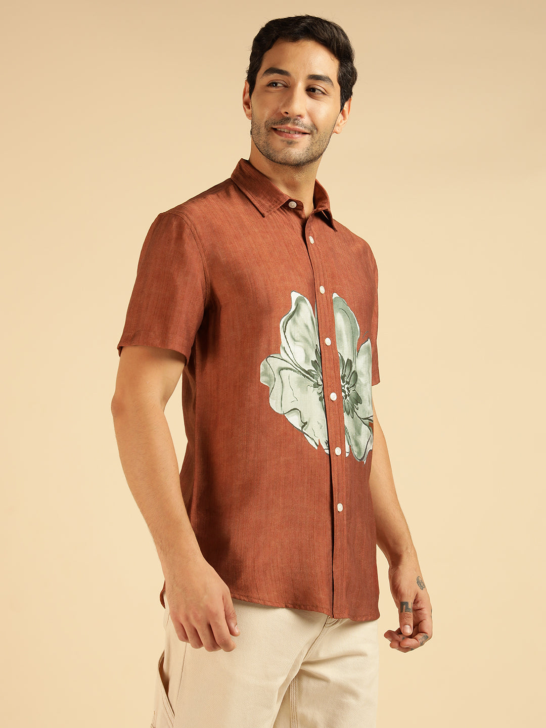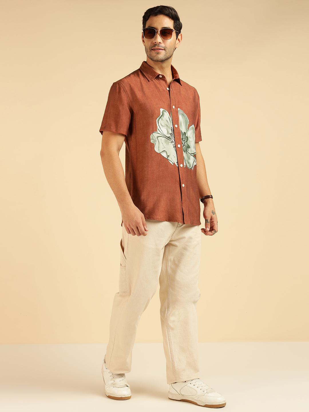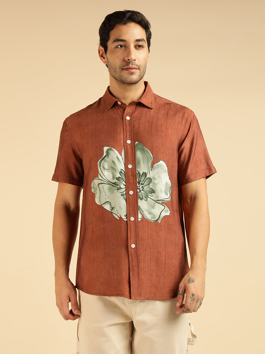 Tan Brown Placement Floral Printed Men Casual Shirt