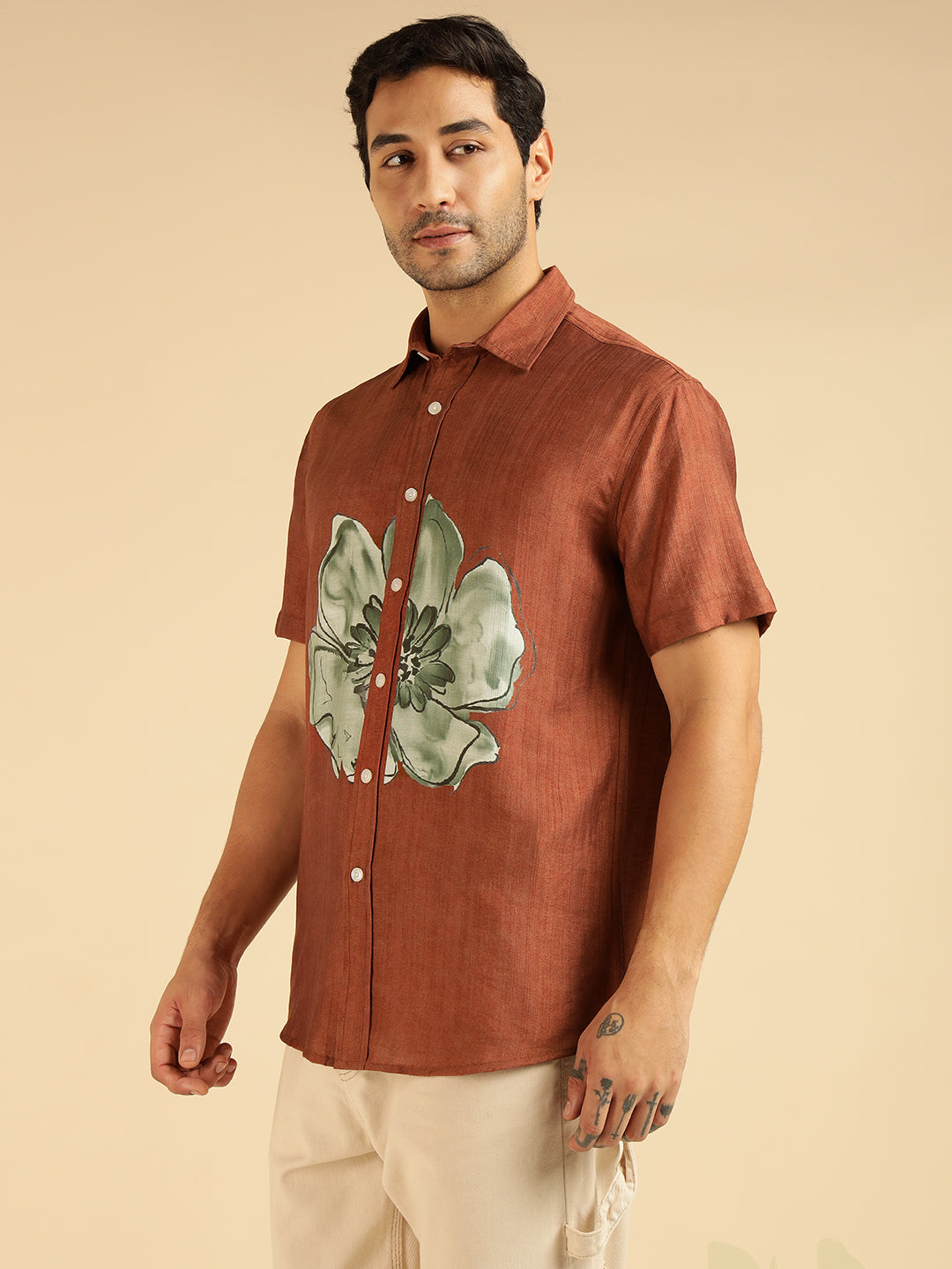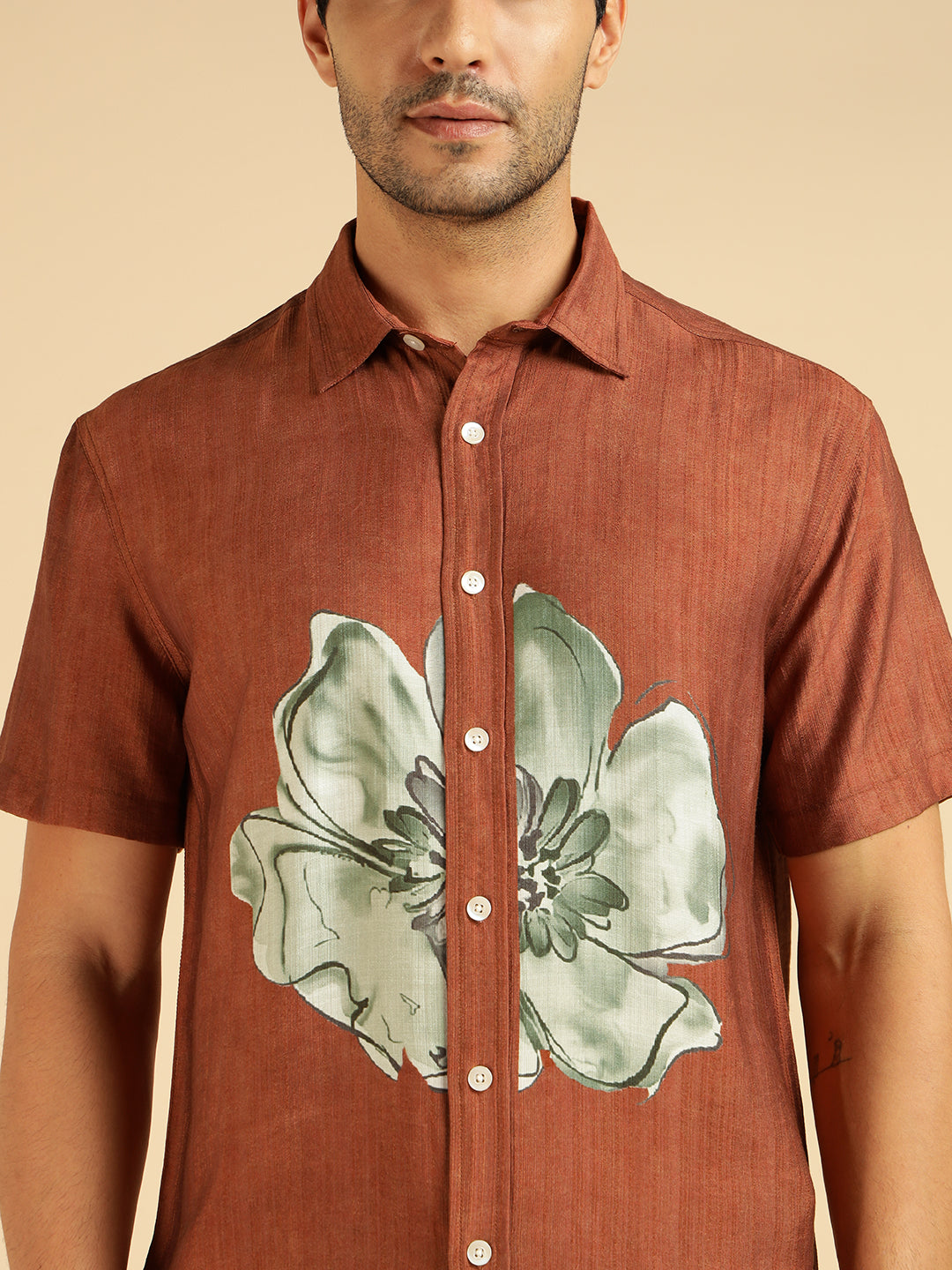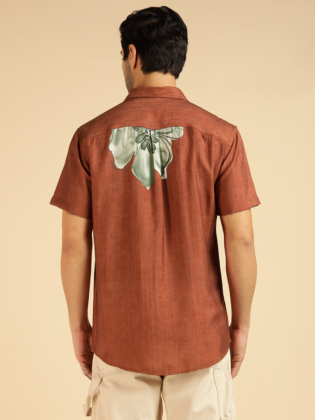 Tan Brown Placement Floral Printed Men Casual Shirt