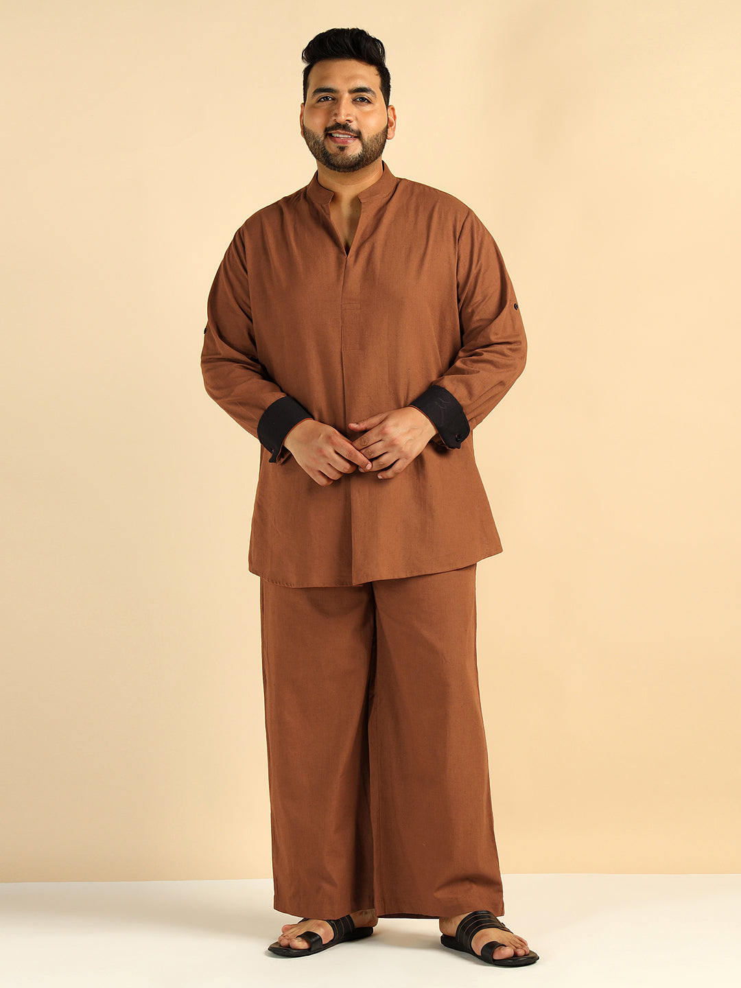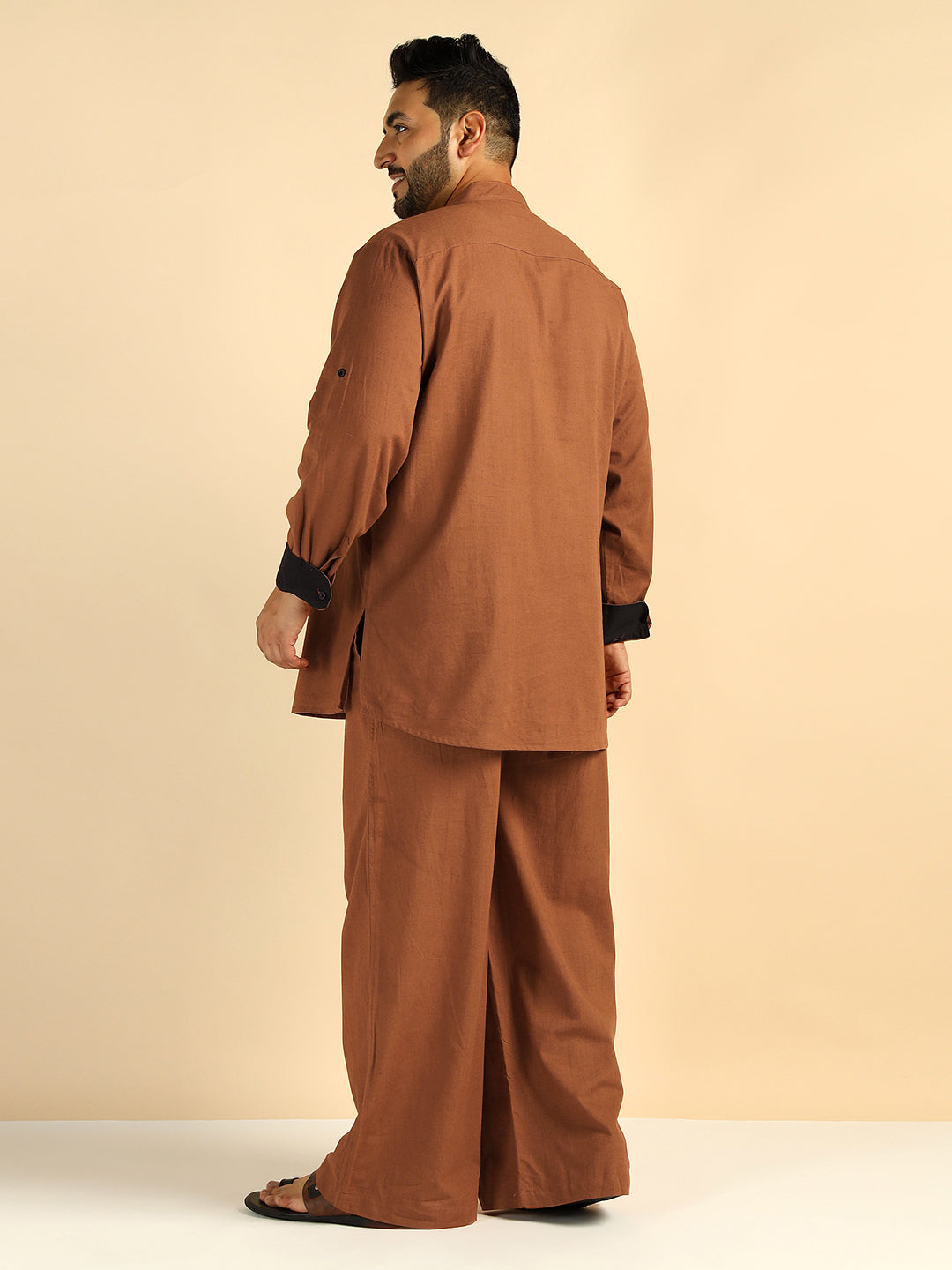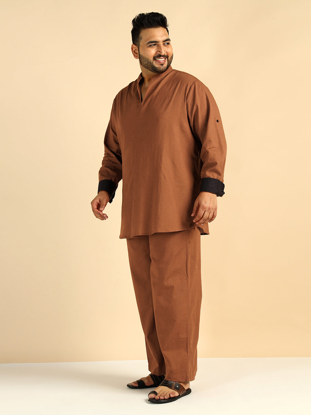 Tan Brown Solid Colour Pure Cotton Plus Size Co-Ord Set For Men